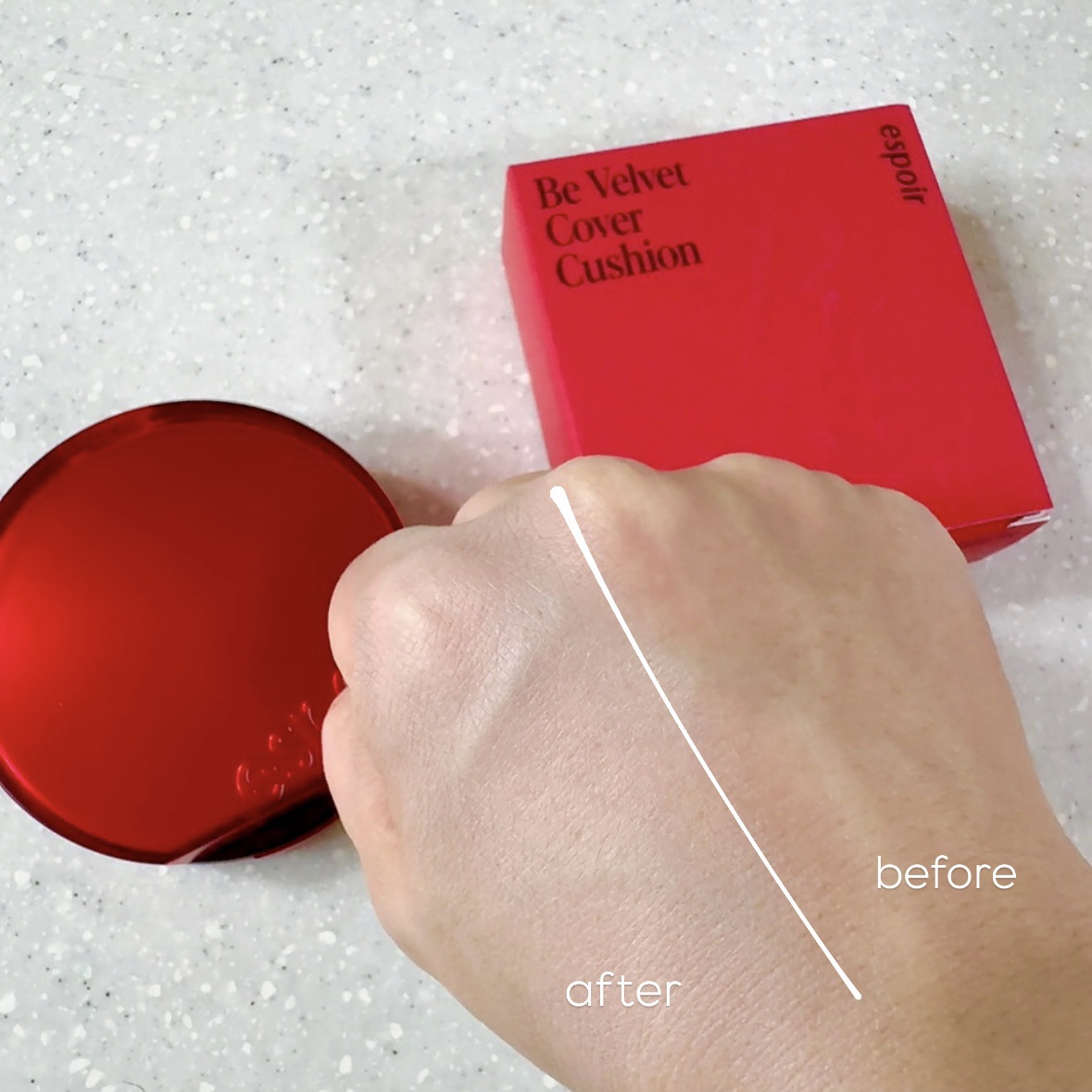 ベルベットのようになめらかで薄いテクスチャーが驚くほど軽くフィットし、しっかりとカバーしてくれるセミマットクッション 肌の悩みもしっかりカバー 肌キメとくすみを一度にカバー! 薄づきなのにカバー力が良く、手の甲に塗ってる写真は重ねづけ無しの一度塗りです。