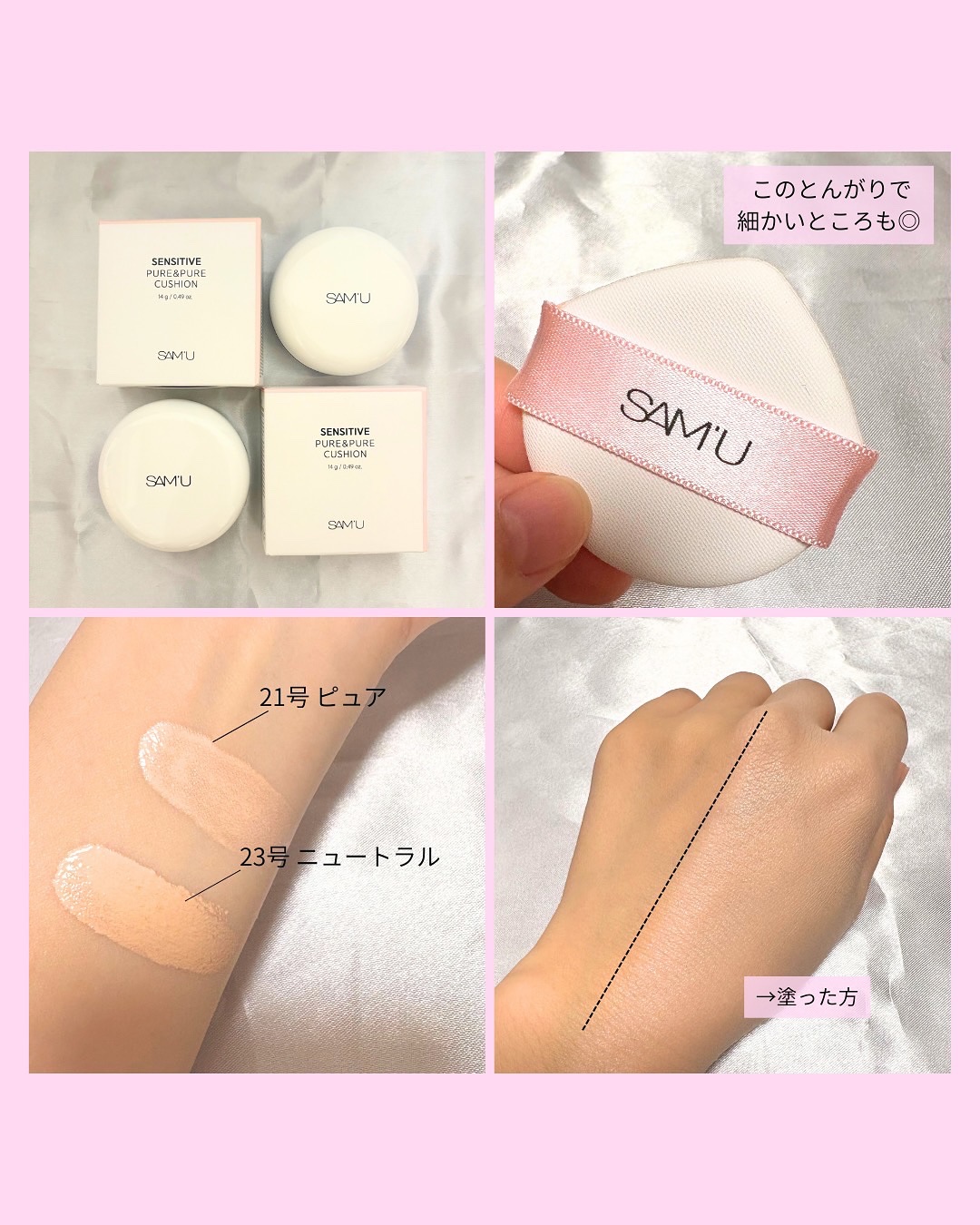 サミュピュアアンドピュアクッション(21号、23号)を使っています21号と23号がありますが私は21号を使っています使ってみた感想は、パフで肌につけてパタパタしたら、あれ?ていうくらいにマットでテカりなし他のブランドのクッションはティッシュオ...