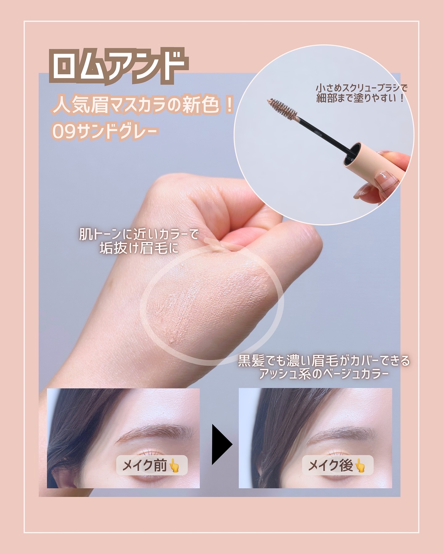 \大人気眉マスカラの新色レビュー🤎/rom&ndハンオールブロウカラ09サンドグレー#PR⋆⋆自眉が濃い人も、これでカバー!新色の09サンドグレーは濃い眉毛もカバーするライトアッシュベージュカラー。\たった3秒で垢抜け眉/が叶う....!!極...