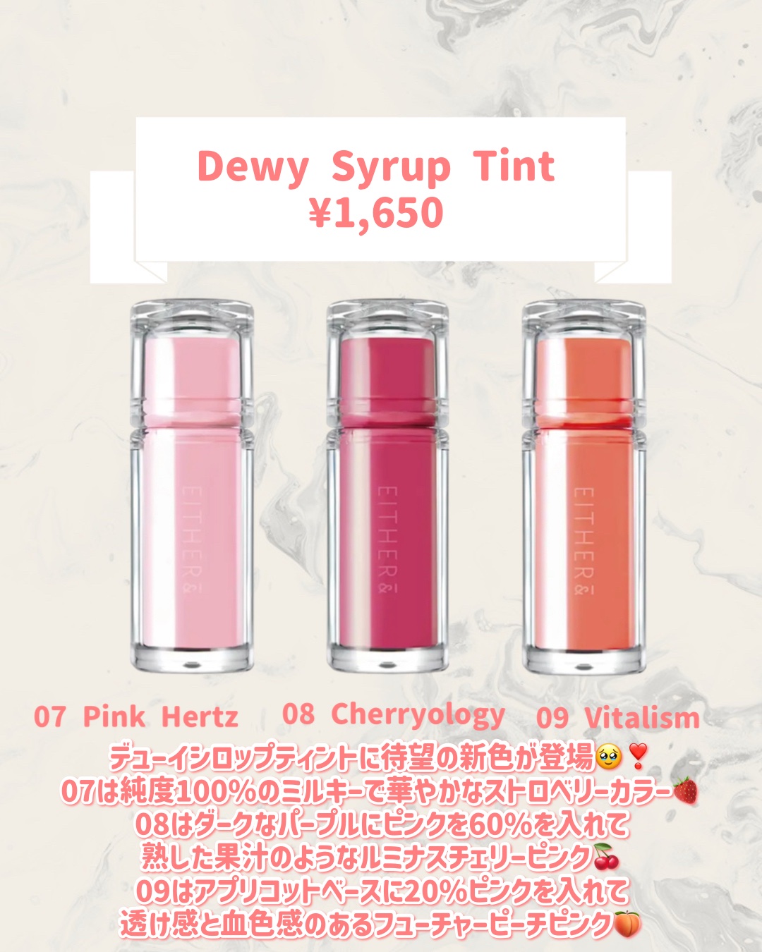 \10/11(土)発売❗️/新作リップEITHER&DewySyrupTint¥1,65007PinkHertz08Cherryology09Vitalism#Qoo10#ティント#飲み会リップ#新作コスメ#リップティント#メガ割#ティントリ...