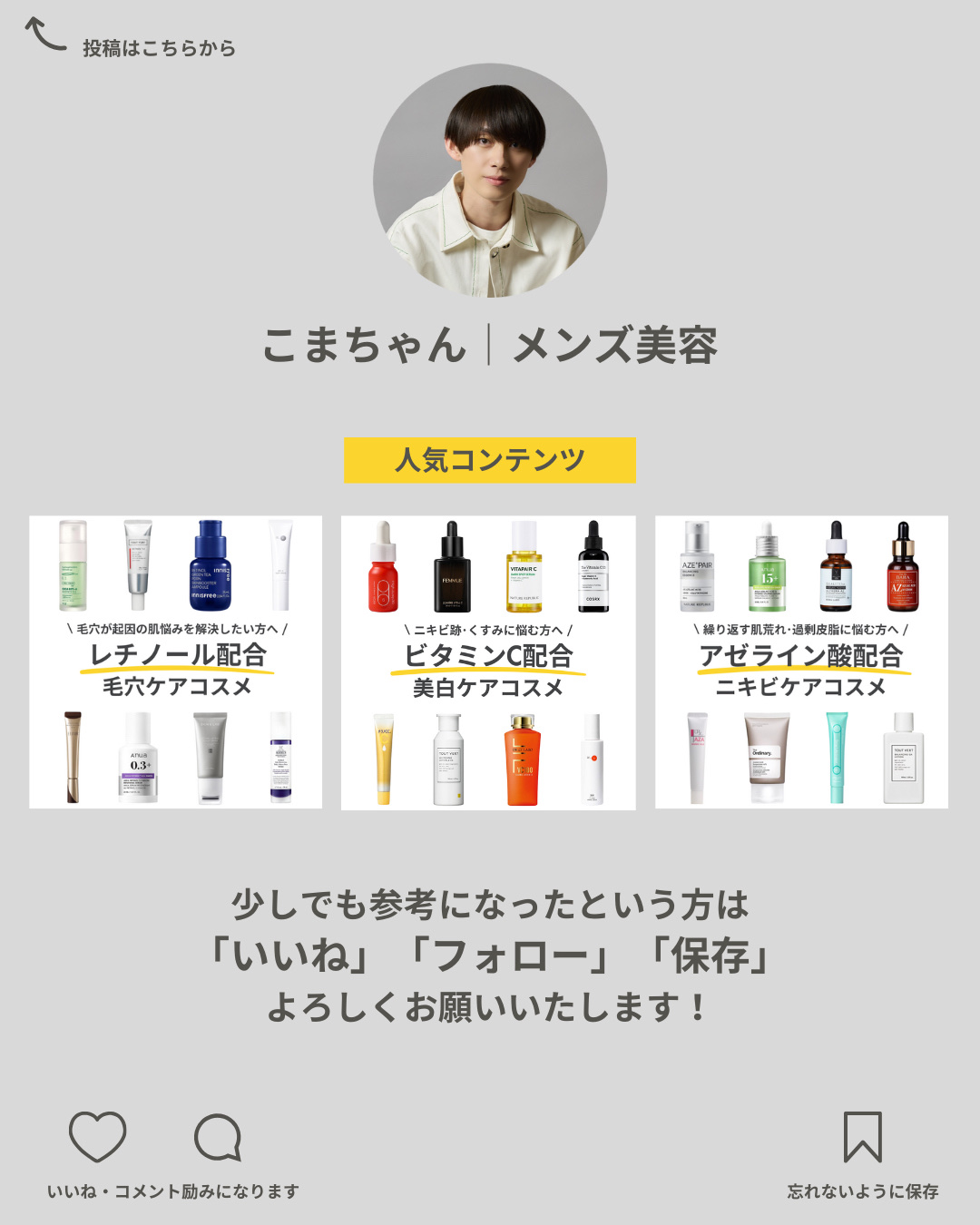 ニキビは日頃の生活習慣や洗顔の方法など様々な要素が原因で現れてしまいます、、! ニキビを早めに対処することはニキビ跡の予防にも繋がります👍 男性だと化粧水と乳液は使うけど、美容液は使わないという方も多いはずなので、投稿を参考にしていただけたらと思います!