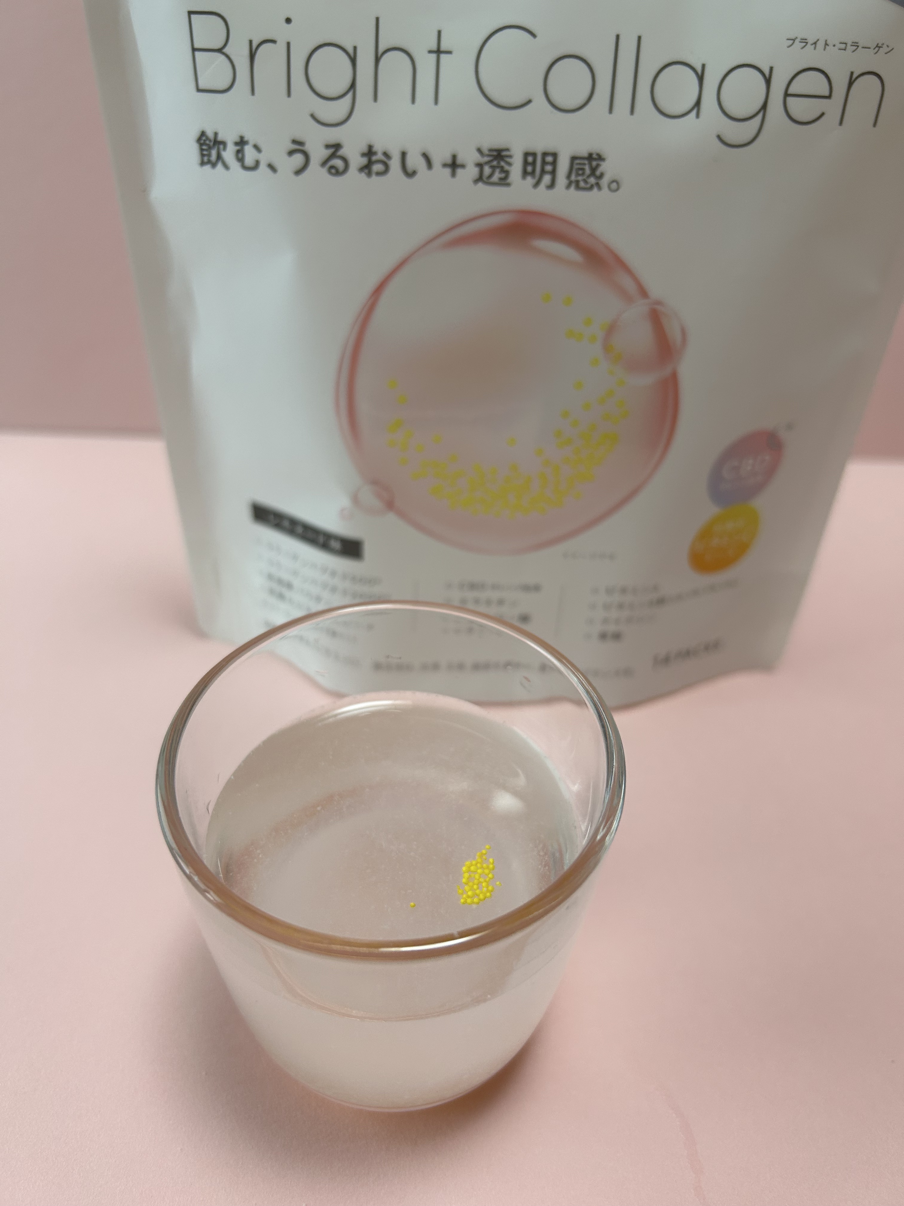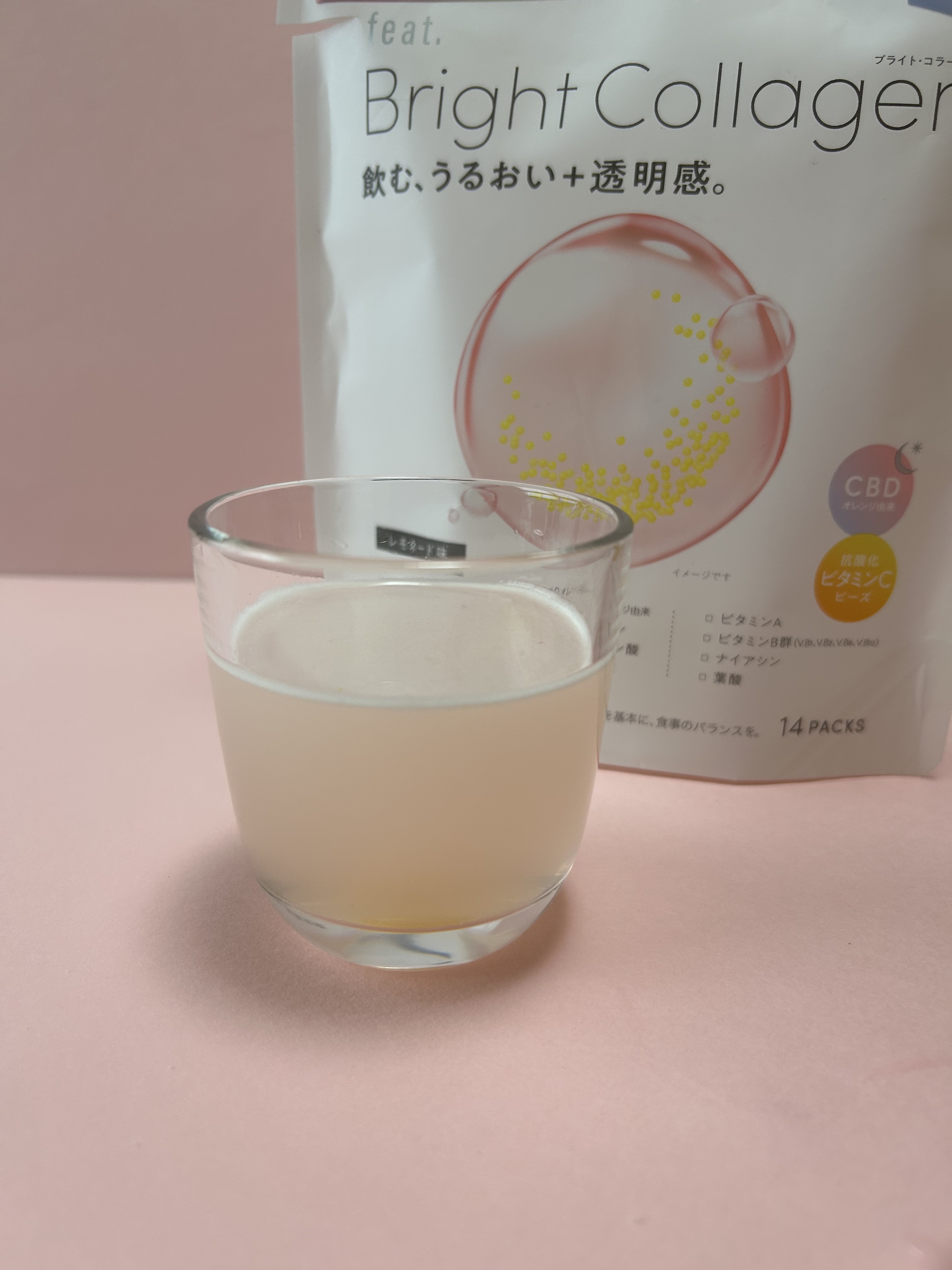 薄ピンクの粉に黄色い粒が入ってる! そのままでも水に溶かしても飲めるとの事で私は水に溶かして飲んでるよ! 味はレモネードで美味しいの!個包装になっているのが便利で、持ち運びも楽チン☆ 手軽に美容パワーを取り入れられるのは嬉しい! コラーゲンやビタミンだけじゃなくて、葉酸も!話題のCBDも入ってる。