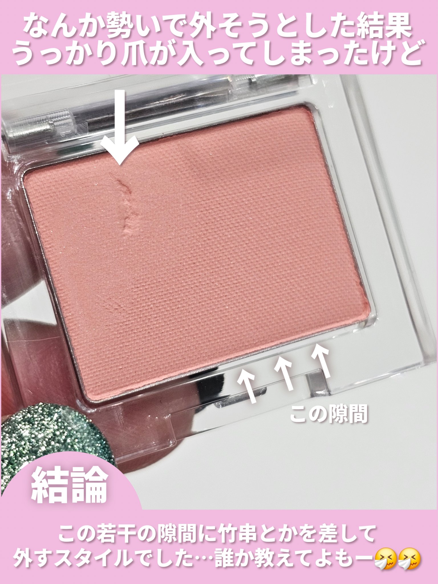 全体のローズ感と粉質もたまらなくいいんですが 左下のハイライトカラー?パールの粉が すんごい涙袋にいいんですよ… パーンとめちゃくちゃ涙袋盛れるけど、 ほんのりピンクがかった白みベージュなので 平成ギャルみたいになるわけではない…と思う ほんとこのハイライトカラーが涙袋に良すぎて いつかここだけ底見えする説…