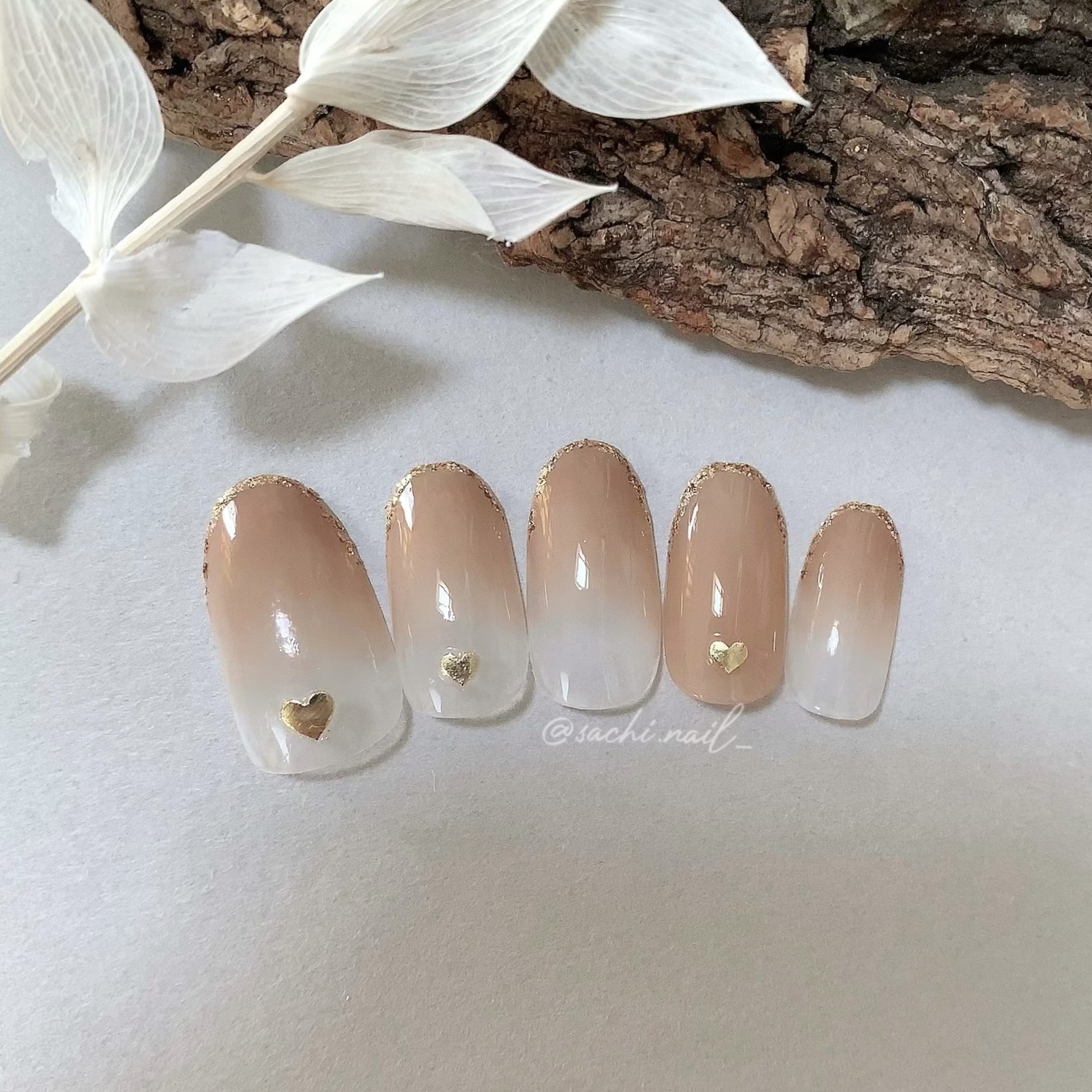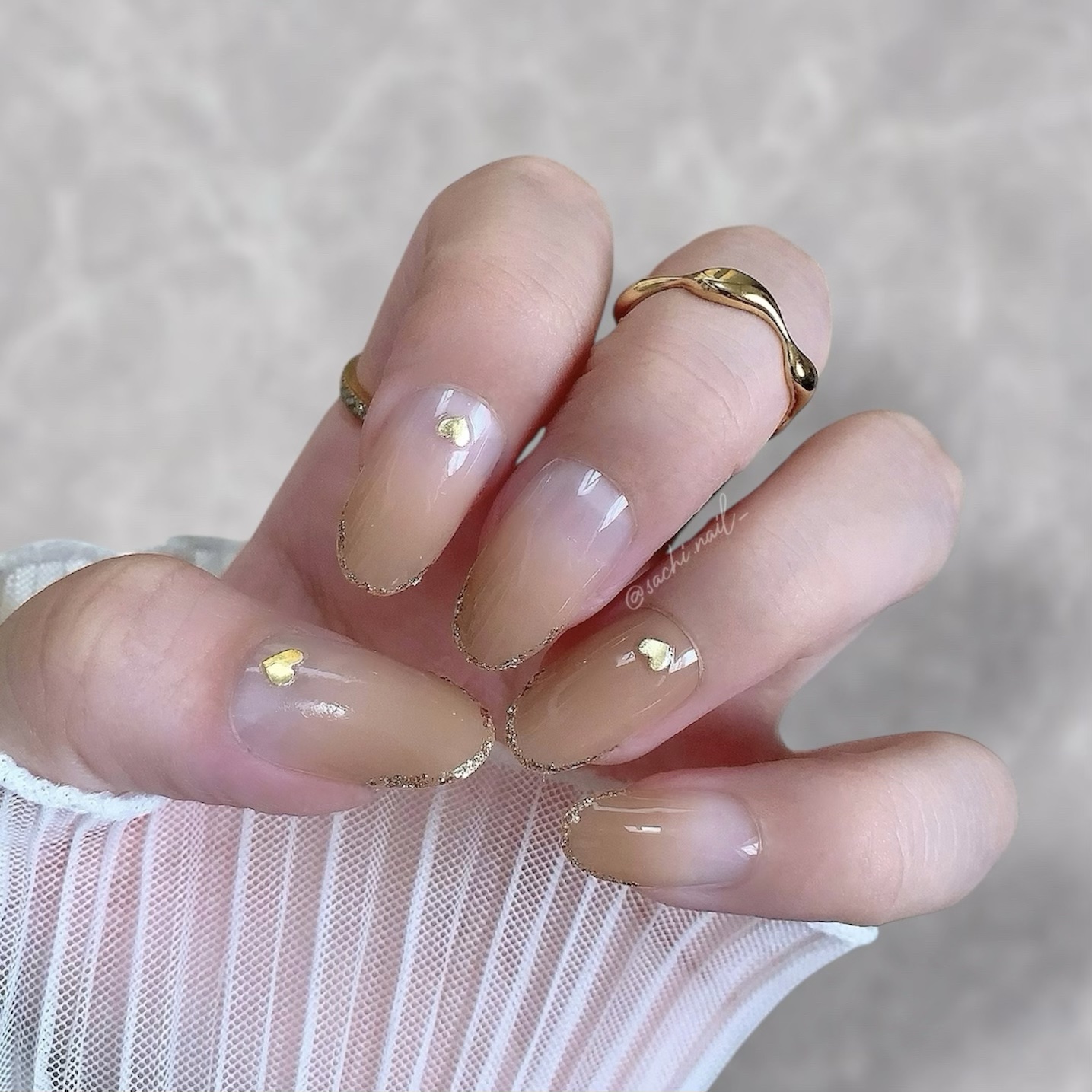 ワンカラーでも指ごとに色を変えるだけでオシャレに見えます💕 画像のようにゴールドラインとストーンを少し足すだけで華やかさがアップ🥰 何度かご紹介したことのあるスポンジで作るグラデーションです✨ スポンジを使うことで境目が綺麗に馴染んでくれます💕 アルミホイルの上でブラウンとトップコートを1:1くらいで混ぜたものを、トップコートのハケに取って3箇所に塗るだけ👌 事前に混ぜたものを塗ることで、爪の上でぼかすより簡単に出来ます💕 ベースカラーが乾く前に点置きしてぼかすことで綺麗にぼかせます✨ スピードが大事なので、使うポリッシュのキャップは全て開けておきましょう😊 天然石のラインはガタガタの方がより天然石っぽく見えるので、ラインを描くのが苦手な方でも大丈夫🙆♀️ 難しそうに見えて、やってみると意外と簡単に出来ます♡