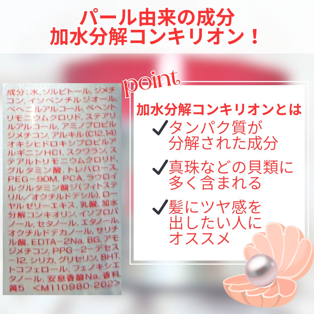 - <本体230g> 水、ソルビトール、ジメチコン、水添ナタネ油アルコール、イソペンチルジオール、ベヘントリモニウムクロリド、アミノプロピルジメチコン、アルキル(C12、14)オキシヒドロキシプロピルアルギニンHCl、ステアリルジヒドロキシプロピルジモニウムオリゴ糖、グルタミン酸、トレハロース、スクワラン、ステアルトリモニウムクロリド、PEG-90M、PCA、ラウロイルグルタミン酸ジ(フィトステリル/オクチルドデシル)、加水分解コムギタンパク、ポリクオタニウム-64、加水分解コムギデンプン、ローヤルゼリーエキス、イソプロパノール、セタノール、オクチルドデカノール、エタノール、PG、BG、トコフェロール、フェノキシエタノール、安息香酸Na、香料、黄5 <つめかえ用700g> 水、ソルビトール、ジメチコン、水添ナタネ油アルコール、イソペンチルジオール、ベヘントリモニウムクロリド、アミノプロピルジメチコン、アルキル(C12、14)オキシヒドロキシプロピルアルギニンHCl、ステアリルジヒドロキシプロピルジモニウムオリゴ糖、グルタミン酸、トレハロース、スクワラン、ステアルトリモニウムクロリド、PEG-90M、PCA、ラウロイルグルタミン酸ジ(フィトステリル/オクチルドデシル)、加水分解コムギタンパク、ポリクオタニウム-64、加水分解コムギデンプン、ローヤルゼリーエキス、イソプロパノール、セタノール、オクチルドデカノール、エタノール、PG、BG、トコフェロール、フェノキシエタノール、安息香酸Na、香料、黄5 <ピンクリボン(230g)> シリカ、水、BG、ジメチコン、ソルビトール、フェノキシエタノール、スクワラン、香料、トコフェロール、エタノール、ローヤルゼリーエキス、セタノール、トレハロース、イソペンチルジオール、イソプロパノール、ベヘントリモニウムクロリド、ポリクオタニウム-64、PCA、PEG-90M、黄5、BHT、ラウロイルグルタミン酸ジ(フィトステリル/オクチルドデシル)、水添ナタネ油アルコール、グルタミン酸、オクチルドデカノール、安息香酸Na、ステアルトリモニウムクロリド、アミノプロピルジメチコン、アルキル(C12、14)オキシヒドロキシプロピルアルギニンHCI