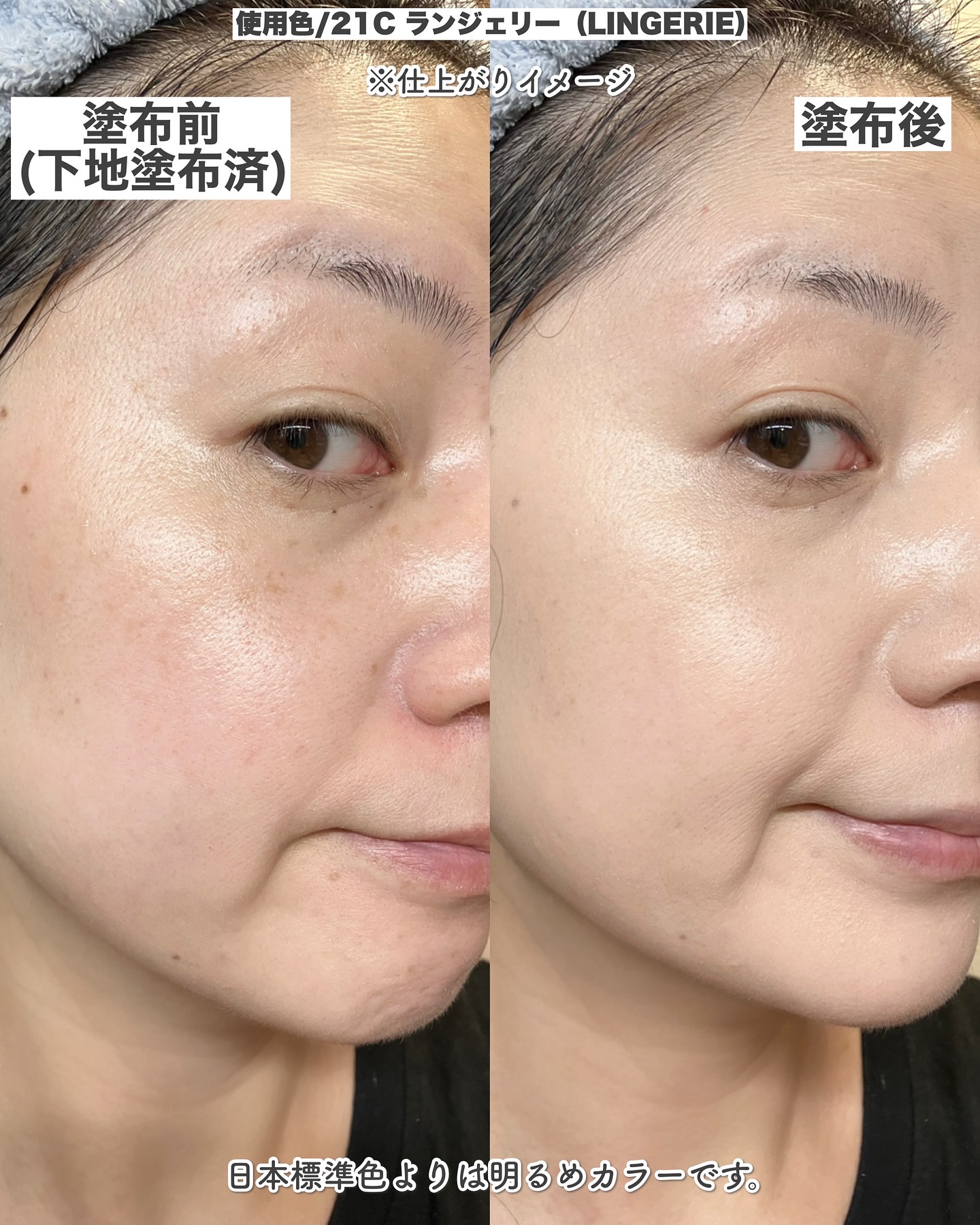 - <19Cライト> 水、ジメチコン、トリメチルシロキシケイ酸、イソドデカン、BG、エチルヘキサン酸セチル、ラウリルPEG-10トリス(トリメチルシロキシ)シリルエチルジメチコン、合成フルオロフロゴパイト、炭酸ジカプリリル、ナイアシンアミド、1,2-ヘキサンジオール、PEG-10ジメチコン、(ビスヒドロキシプロピルジメチコン/SMDI)コポリマー、硫酸Mg、ペンタイソステアリン酸ジペンタエリスリチル、ステアリン酸、トリエトキシカプリリルシラン、アルミナ、水酸化Al、(ジメチコン/ビニルジメチコン)クロスポリマー、オクチルドデカノール、香料、ジステアルジモニウムヘクトライト、アデノシン、エチレンジアミンジコハク酸3Na、イソステアリン酸ポリグリセリル-4、ジミリスチン酸Al、トリイソステアリン酸イソプロピルチタン、トコフェロール、ツボクサ葉エキス、酸化チタン、酸化鉄、マイカ <21C ランジェリー> 水、ジメチコン、トリメチルシロキシケイ酸、イソドデカン、BG、エチルヘキサン酸セチル、ラウリルPEG-10トリス(トリメチルシロキシ)シリルエチルジメチコン、合成フルオロフロゴパイト、炭酸ジカプリリル、ナイアシンアミド、1,2-ヘキサンジオール、PEG-10ジメチコン、(ビスヒドロキシプロピルジメチコン/SMDI)コポリマー、硫酸Mg、ペンタイソステアリン酸ジペンタエリスリチル、オクチルドデカノール、ステアリン酸、トリエトキシカプリリルシラン、アルミナ、水酸化Al、(ジメチコン/ビニルジメチコン)クロスポリマー、香料、ジステアルジモニウムヘクトライト、イソステアリン酸ポリグリセリル-4、アデノシン、エチレンジアミンジコハク酸3Na、ジミリスチン酸Al、トリイソステアリン酸イソプロピルチタン、トコフェロール、ツボクサ葉エキス、酸化チタン、酸化鉄、マイカ <21N リネン> 水、ジメチコン、トリメチルシロキシケイ酸、イソドデカン、BG、エチルヘキサン酸セチル、ラウリルPEG-10トリス(トリメチルシロキシ)シリルエチルジメチコン、合成フルオロフロゴパイト、炭酸ジカプリリル、ナイアシンアミド、1,2-ヘキサンジオール、PEG-10ジメチコン、(ビスヒドロキシプロピルジメチコン/SMDI)コポリマー、硫酸Mg、ペンタイソステアリン酸ジペンタエリスリチル、オクチルドデカノール、ステアリン酸、トリエトキシカプリリルシラン、アルミナ、水酸化Al、(ジメチコン/ビニルジメチコン)クロスポリマー、香料、ジステアルジモニウムヘクトライト、イソステアリン酸ポリグリセリル-4、アデノシン、エチレンジアミンジコハク酸3Na、ジミリスチン酸Al、トリイソステアリン酸イソプロピルチタン、トコフェロール、ツボクサ葉エキス、酸化チタン、酸化鉄、マイカ <23N ジンジャー> 水、ジメチコン、トリメチルシロキシケイ酸、イソドデカン、BG、エチルヘキサン酸セチル、ラウリルPEG-10トリス(トリメチルシロキシ)シリルエチルジメチコン、合成フルオロフロゴパイト、炭酸ジカプリリル、ナイアシンアミド、1,2-ヘキサンジオール、PEG-10ジメチコン、(ビスヒドロキシプロピルジメチコン/SMDI)コポリマー、オクチルドデカノール、硫酸Mg、ペンタイソステアリン酸ジペンタエリスリチル、ステアリン酸、トリエトキシカプリリルシラン、アルミナ、水酸化Al、(ジメチコン/ビニルジメチコン)クロスポリマー、香料、イソステアリン酸ポリグリセリル-4、ジステアルジモニウムヘクトライト、トリイソステアリン酸イソプロピルチタン、アデノシン、エチレンジアミンジコハク酸3Na、ジミリスチン酸Al、トコフェロール、ツボクサ葉エキス、酸化チタン、酸化鉄、マイカ