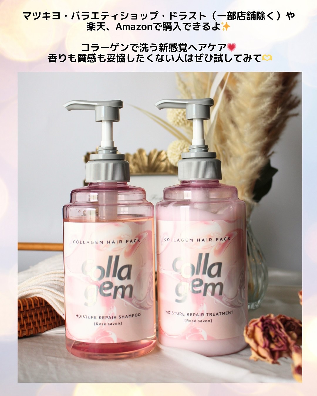 - 洗うだけで、濃密コラーゲンヘアパック※1,4,5,6 「コラジェム モイスチャーリペアシャンプー&トリートメント」 コラーゲン由来の洗浄成分※1配合(※シャンプーのみ) 乾燥・パサつく髪に【高浸透&保水】 まとまる、ぷるうる髪へ ◎リッチハイドレーション処方 【髪内部の崩れた保水の構造※2を補修】 パサついて硬くなった髪をなめらかに ➀スクワラン※3 髪内部に浸透し、潤いとしなやかさを与える ➁モイスチャーオイル※4 髪を補修・保護し、なめらかな手触りに 【コラーゲン美容補修成分※5,6】 ➀デュアルリペアコラーゲン※5 大きさが違う2つのコラーゲンが 内部と外部から潤い浸透、洗うたび補修 ➁ヒートケアコラーゲンMIX※6,7 熱を味方にしてアイロンなどの熱ダメージから キューティクルを補修・保護 「ほんのり甘く透明感のある ロゼサボンの香り で癒しのバスタイムに」 ※1 ココイル加水分解コラーゲンK(洗浄成分) ※2 毛髪の水分と油分のバランスのこと ※3 エモリエント成分 ※4 マカデミア種子油、ヒマワリ種子油(すべてエモリエント成分) ※5 サクシノイルアテロコラーゲン、加水分解コラーゲン(すべて毛髪補修成分) ※6 加水分解コラーゲンPGプロピルメチルシランジオール(毛髪補修成分) ※7 グルコシルヘスペリジン(保湿成分)