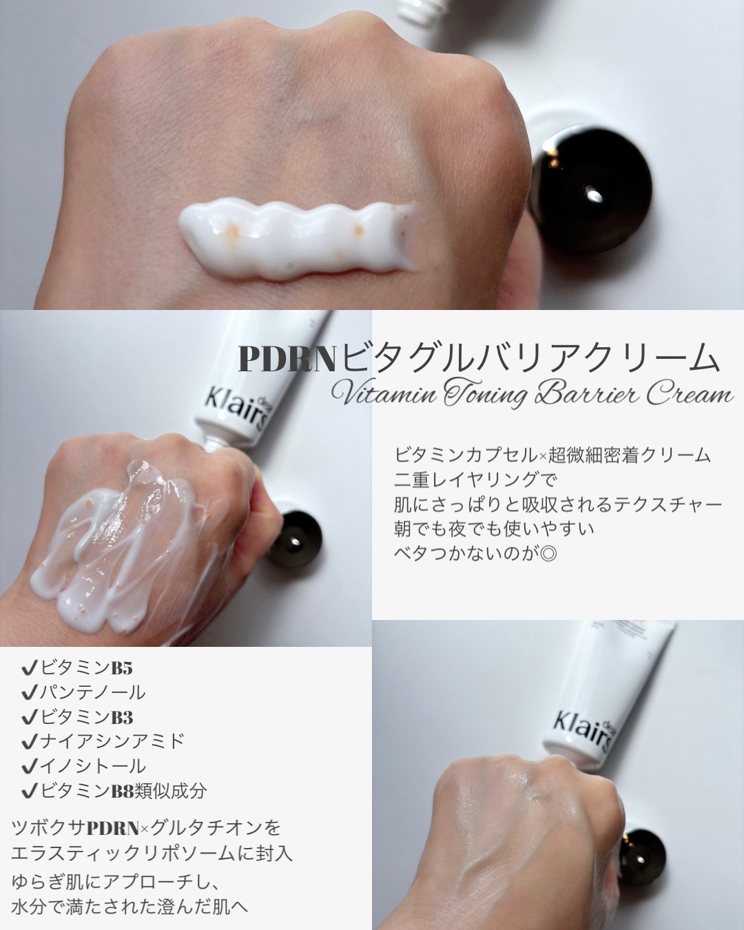 #PRKlairs@klairs.jpクレアスのビタミンラインをお試ししました🍋☑︎PDRNビタグルバリアクリームツボクサ由来PDRN•Barrier-min™•Glow-tamin™などの美容成分を配合した保湿クリーム。吸収と効果を高めるカ...