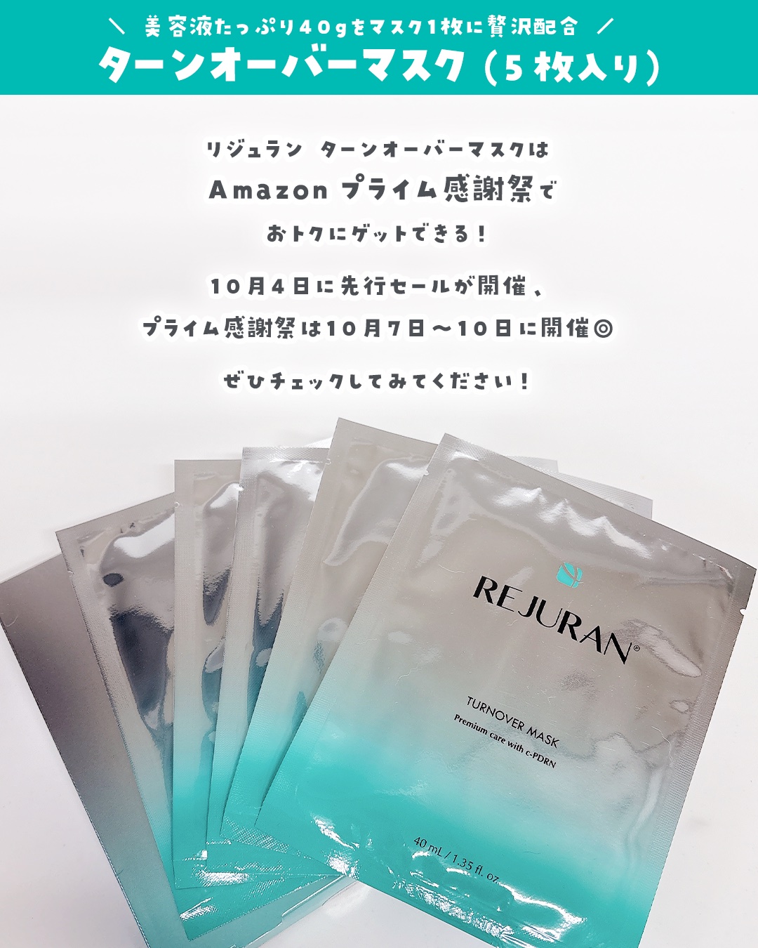 #PRREJURAN様ターンオーバーマスク(5枚入り)をご提供いただきました🩵パック1枚に40gの美容液1本分!!REJURAN独自のc-PDRNは人体と95%類似したサーモンDNAから抽出♡パックケア後滑らかでしっとりとしたツヤ・ハリ肌が完...