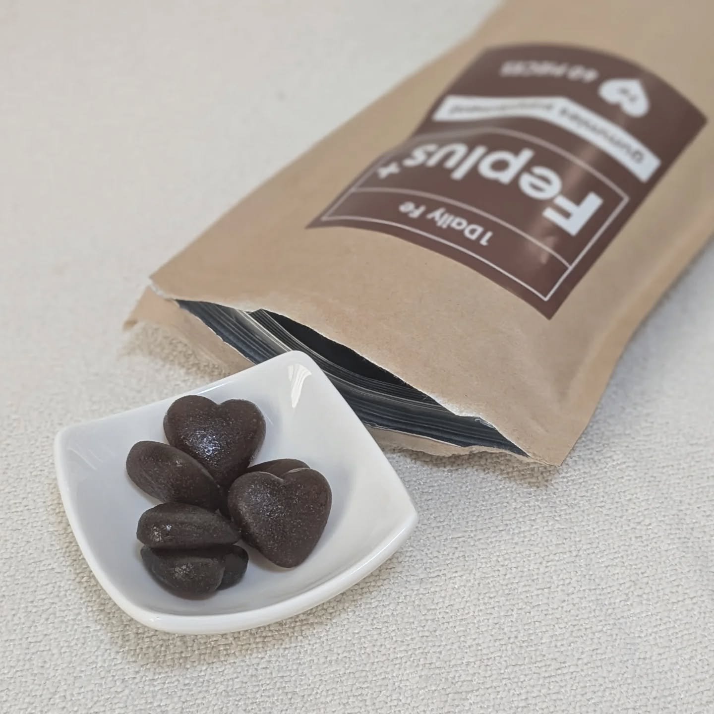 鉄分摂れるグミサプリ🤎鎌倉ライフのFeplus(エフイープラス)コーラ味60粒(2ヶ月分)ハート型のかわいいグミですが、これ1粒で1日分の鉄分が摂れるそう。鉄7.0mg葉酸200μgフレーバーは他にもブルーベリー味があります。食べや...