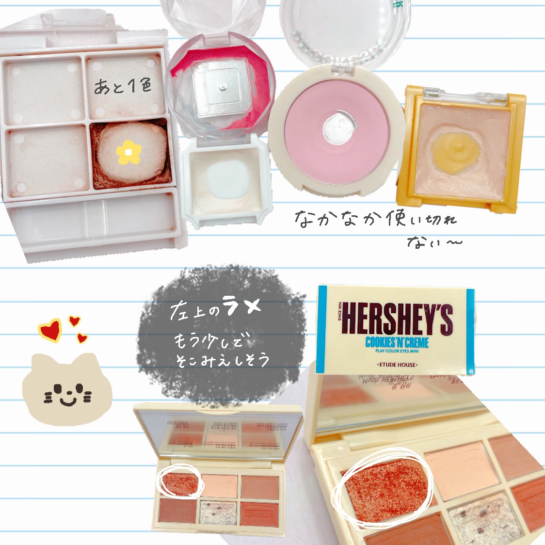 1番薄いカラーのみ使い切り! 他の色味は割れたり、ケーキングしてしまった🥲 使用期限も気になるので手放します! 2月の断捨離に仲間入りさせます⛅️ あと、もう少し薄いカラーが好みだと気づきました!