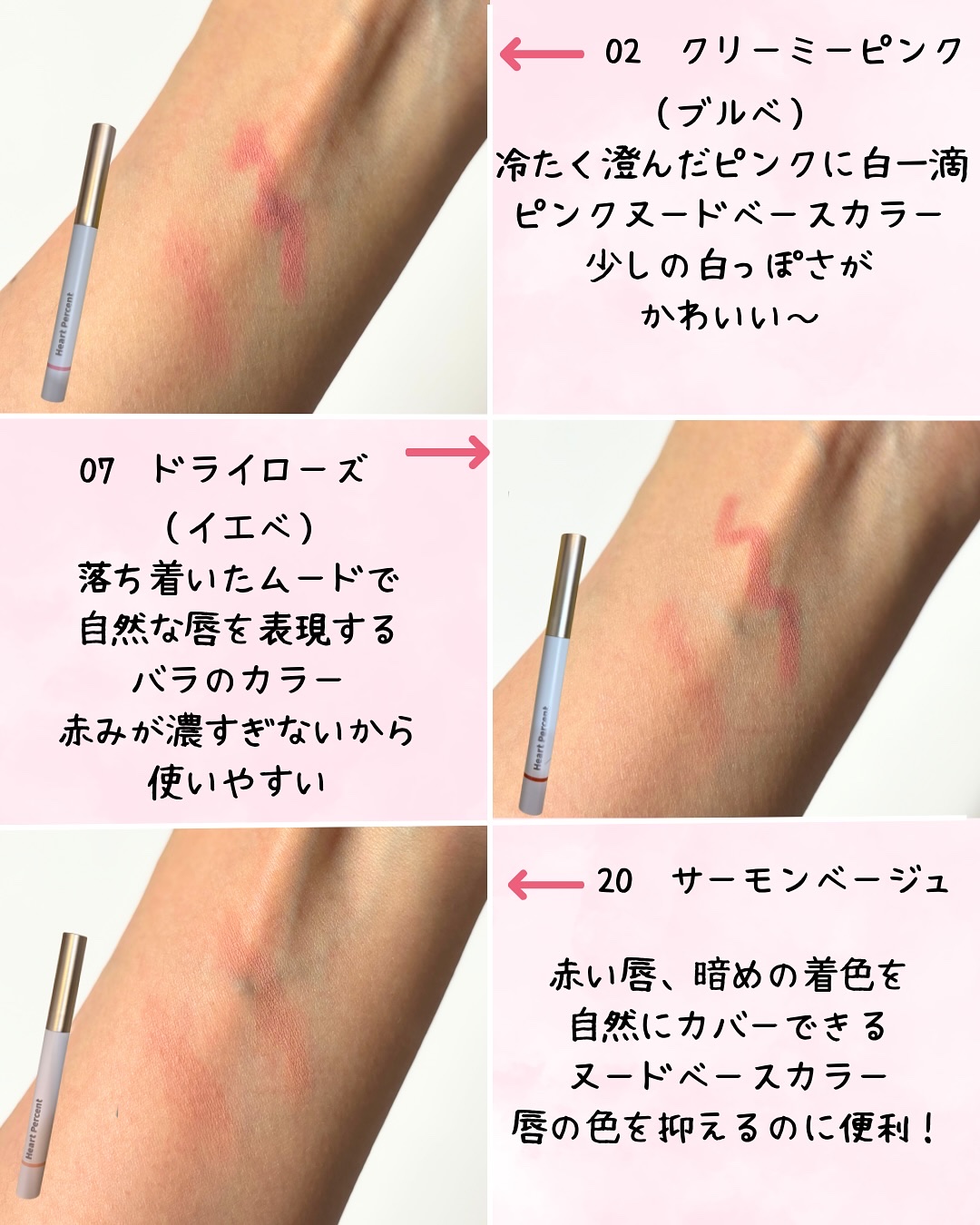 HeartPercentハートパーセントドットオンムードリップペンシル02クリーミーピンク/14カームピンク/19ダスティピンクふんわりマットな発色のリップペンシル✨️唇のラインよりオーバーリップにしてもぷっくりとした唇にみえて可愛いかも😆ド...