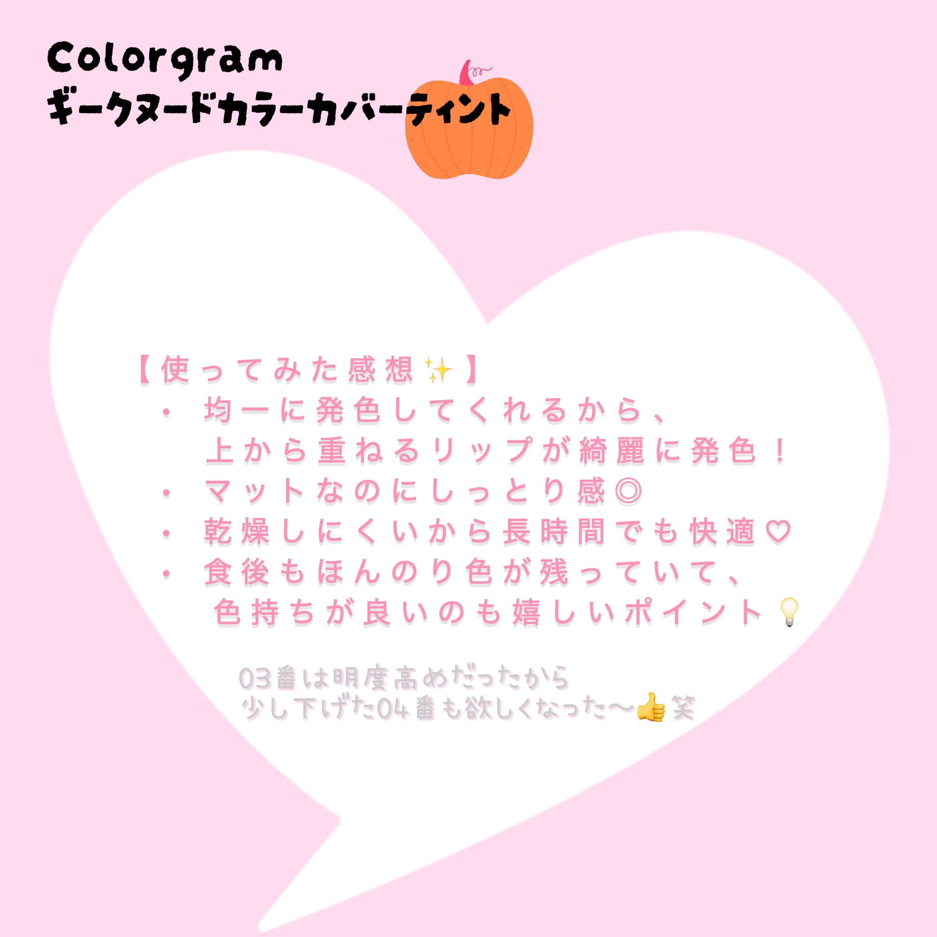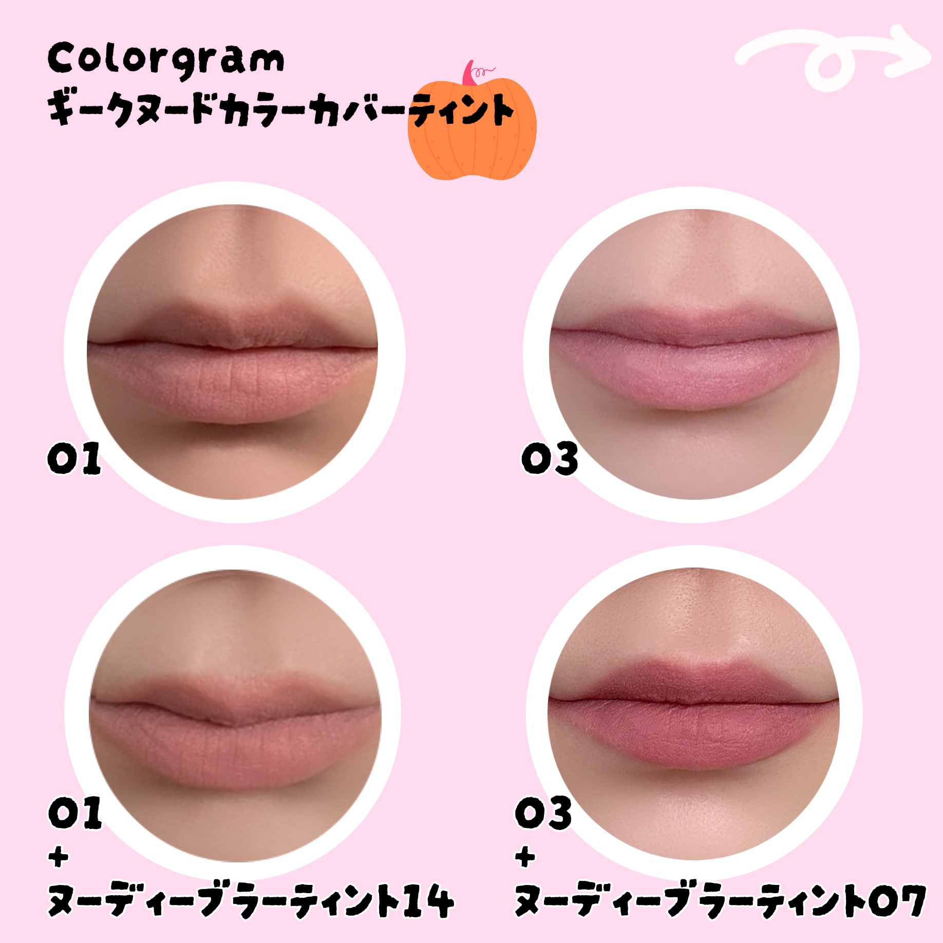 Colorgramヌーディーブラーティント07ギークローズギークヌードカラーカバーティント04クールヌード23唇の角質、シワを綺麗にカバーし密着!塗り心地のよいふんわりティント📍ひと塗りでフィルターをかけたような唇に!📍マットテクスチャーが薄...
