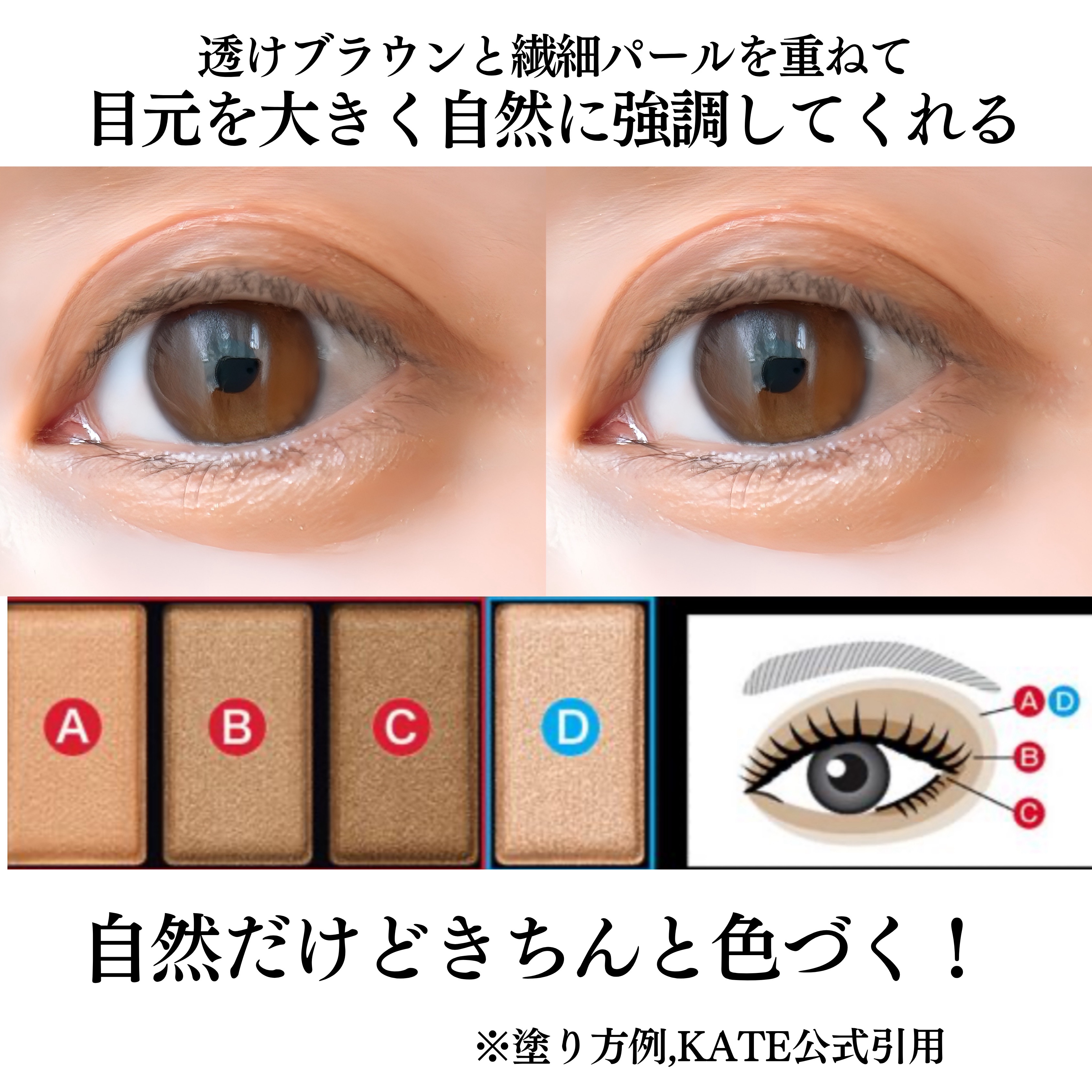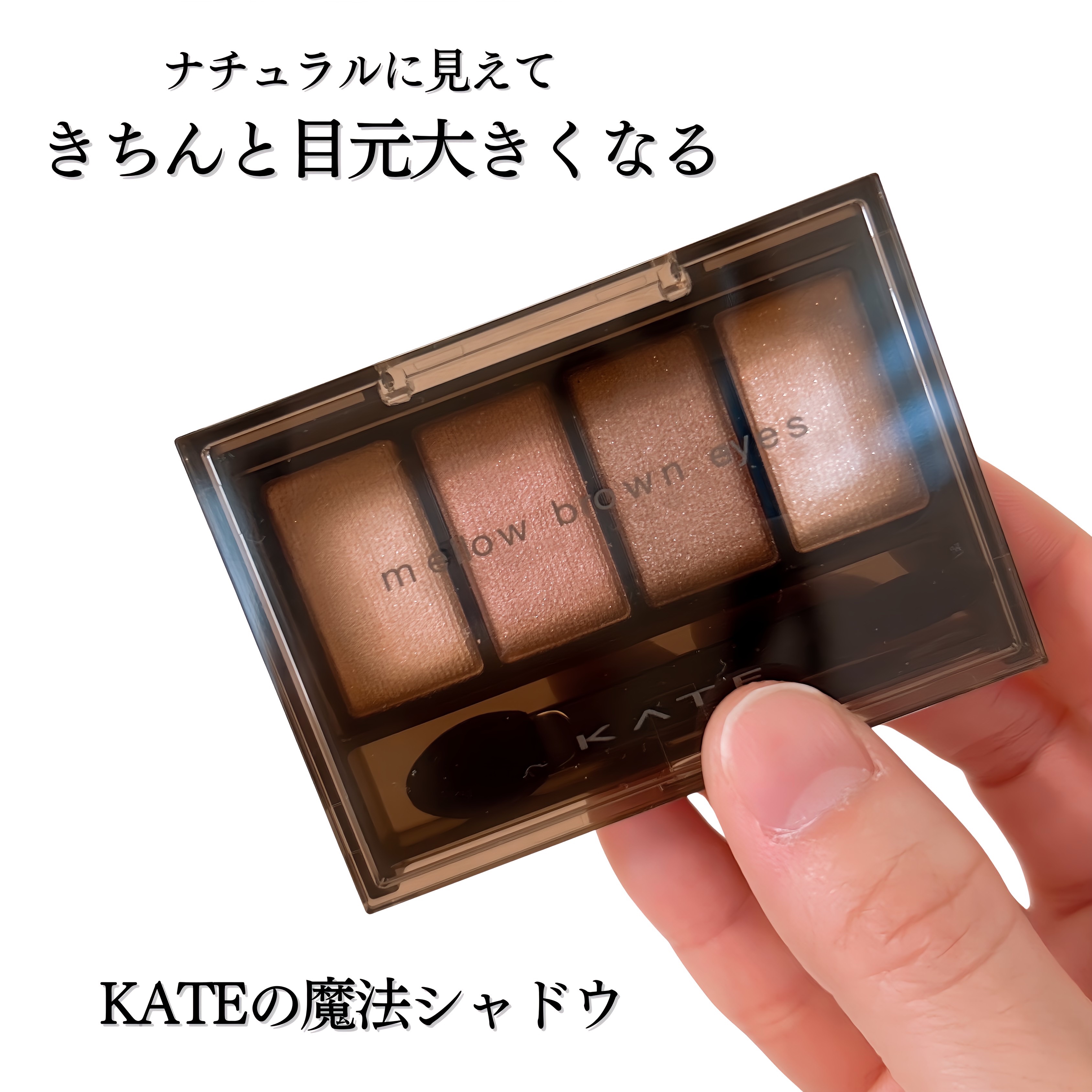 透けブラウン×繊細パールで、軽やかに引き立つ、大きな目もと印象へ。 私は大きめパールは得意なのでこれは有り!シアーな感じなのでガッツリメイクがお好みの方は物足りなさを感じるかもですが、重ねても綺麗な色出しがお気に入り✨ KATEのほかのアイシャドウより手を出しやすい価格です