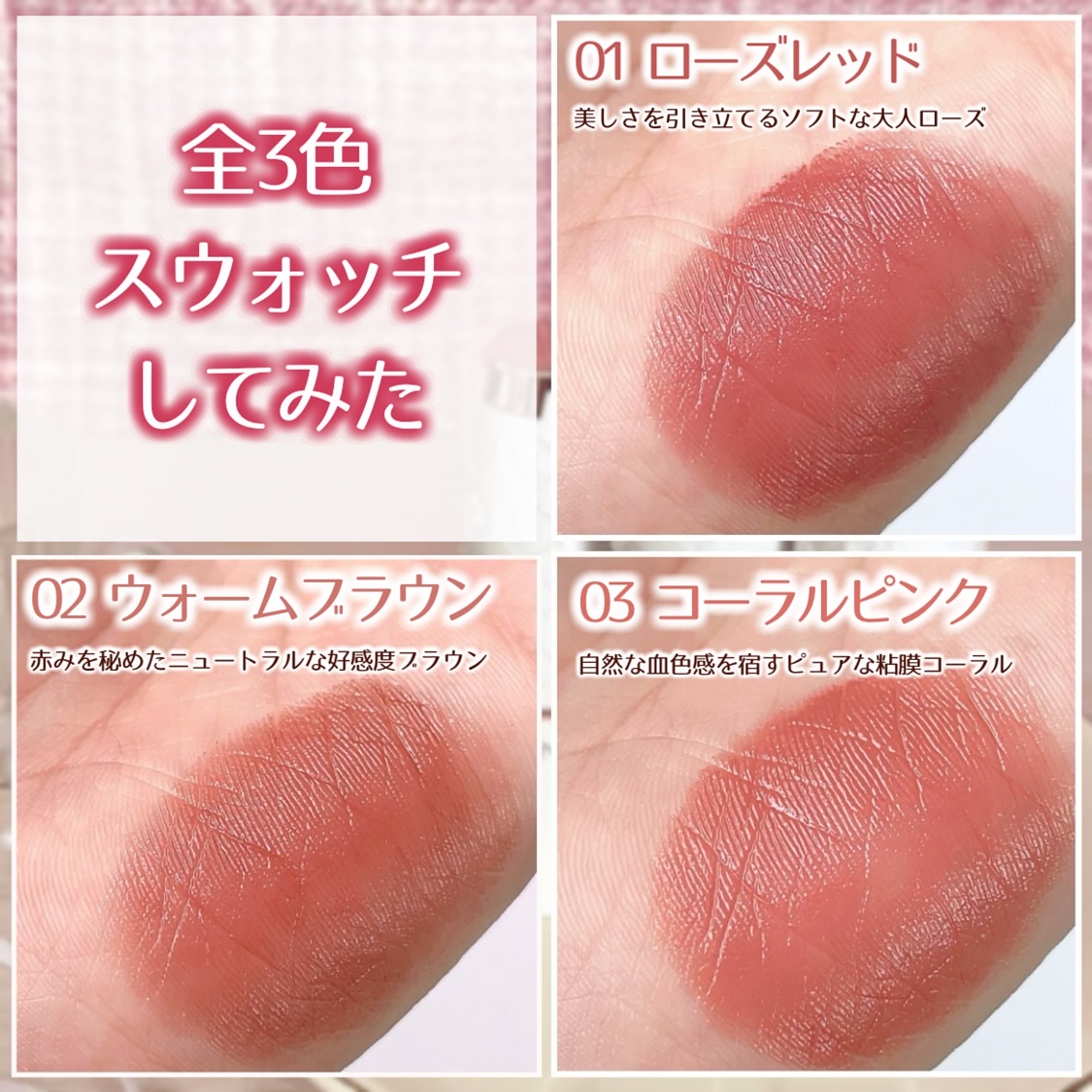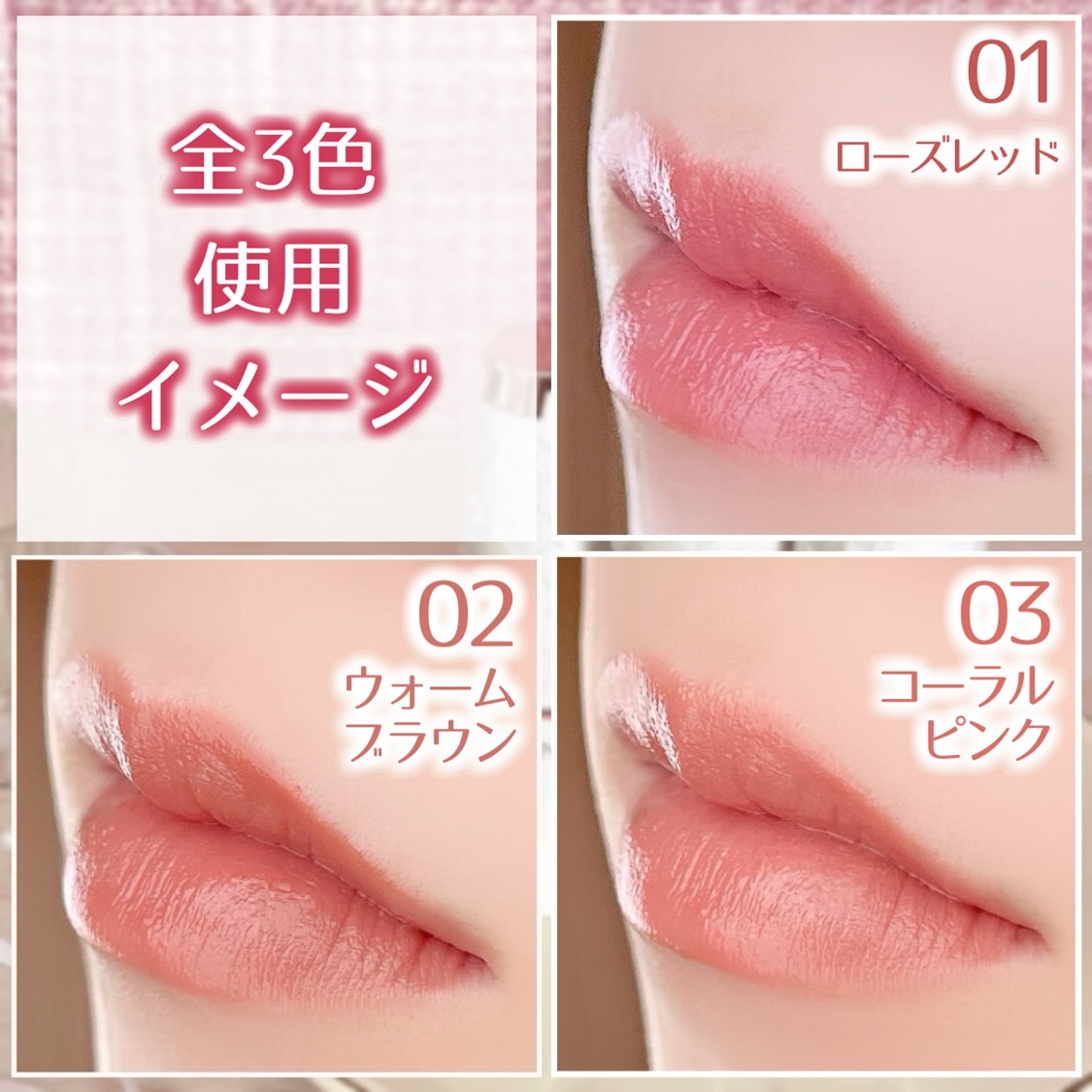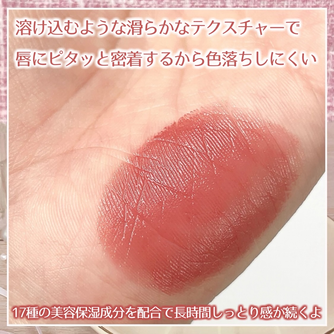 - 〈01 ローズレッド〉 トリエチルヘキサノイン、トリイソステアリン酸ポリグリセリル-2、リンゴ酸ジイソステアリル、水添ポリイソブテン、合成ワックス、ダイマージリノール酸水添ヒマシ油、シア脂、カルナウバロウ、ラウロイルグルタミン酸ジ(フィトステリル/オクチルドデシル)、キャンデリラロウエステルズ、トコフェロール、水、BG、クエン酸、ヒアルロン酸Na、水添レシチン、アルニカ花エキス、フィトステロールズ、メチルパラベン、セラミドNG、セラミドAP、セラミドAG、セラミドNP、セラミドEOP、酸化鉄、酸化チタン、水酸化Al、赤202、赤218 〈02 ウォームブラウン〉 トリエチルヘキサノイン、トリイソステアリン酸ポリグリセリル-2、リンゴ酸ジイソステアリル、水添ポリイソブテン、合成ワックス、ダイマージリノール酸水添ヒマシ油、シア脂、カルナウバロウ、ラウロイルグルタミン酸ジ(フィトステリル/オクチルドデシル)、キャンデリラロウエステルズ、トコフェロール、水、BG、クエン酸、ヒアルロン酸Na、水添レシチン、アルニカ花エキス、フィトステロールズ、メチルパラベン、セラミドNG、セラミドAP、セラミドAG、セラミドNP、セラミドEOP、酸化鉄、酸化チタン、水酸化Al、赤202、赤218 〈03 コーラルピンク〉 トリエチルヘキサノイン、トリイソステアリン酸ポリグリセリル-2、リンゴ酸ジイソステアリル、水添ポリイソブテン、合成ワックス、ダイマージリノール酸水添ヒマシ油、シア脂、カルナウバロウ、ラウロイルグルタミン酸ジ(フィトステリル/オクチルドデシル)、キャンデリラロウエステルズ、トコフェロール、水、BG、クエン酸、ヒアルロン酸Na、水添レシチン、アルニカ花エキス、フィトステロールズ、メチルパラベン、セラミドNG、セラミドAP、セラミドAG、セラミドNP、セラミドEOP、酸化鉄、酸化チタン、水酸化Al、赤202、赤218