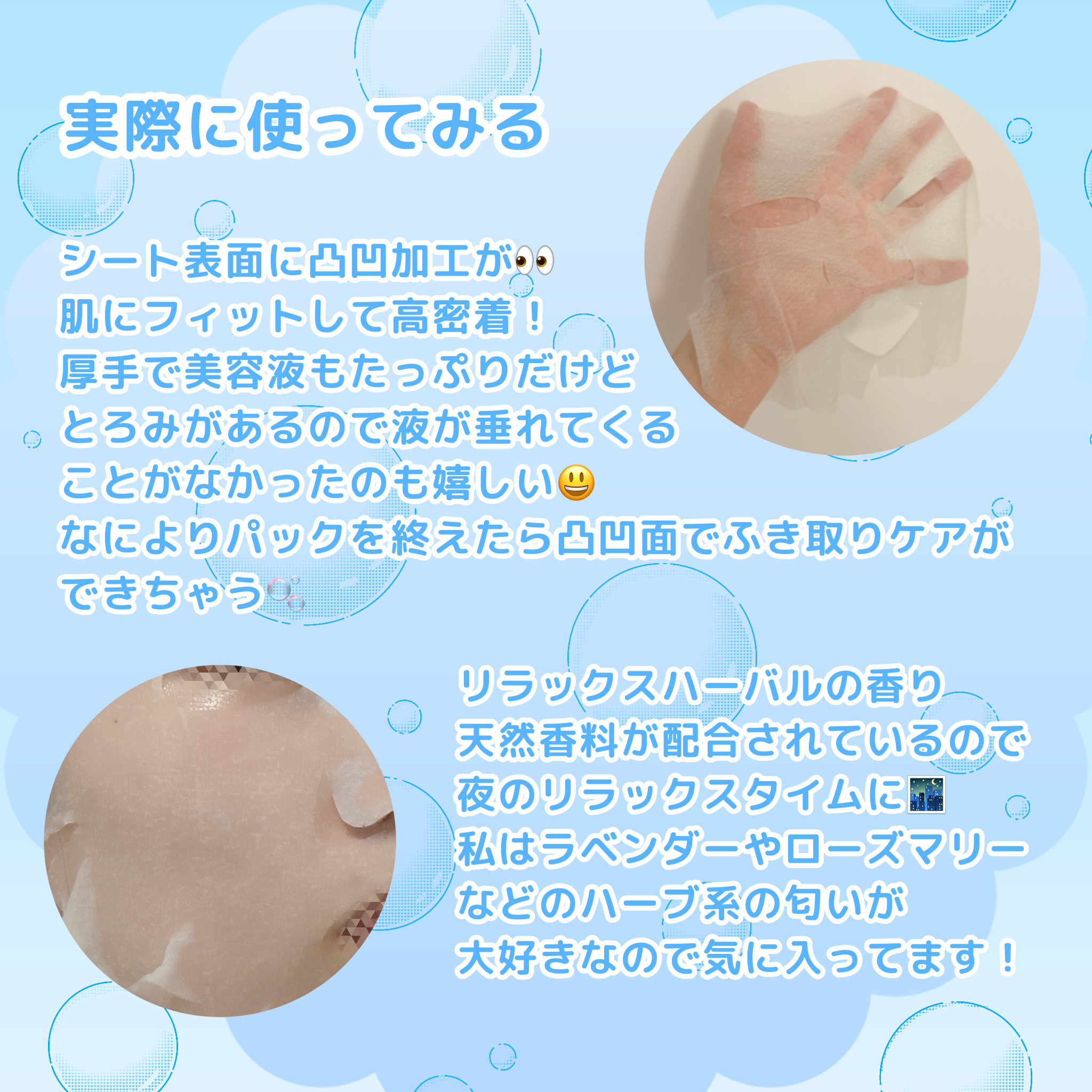 ミントグリーンのかわいい容器にテンション上がります! シートの薄さ!薄くて肌にぴったりと密着するので使い心地は◎ 匂い(リラックスフローラルの香り)はふわっと香ります。あまり匂いつきの製品が好きではない方にもオススメ つける時間が3分!短い時間なので時間がない方、スキンケアを手短にしたい方にはぴったりなアイテムです。