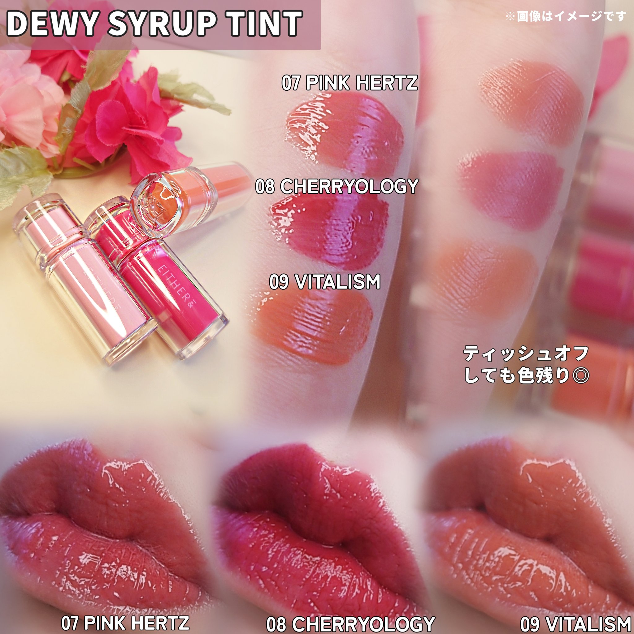 ❁❁❁☑️EITHER&┆DewySyrupTint▼07PINKHERTZ▼08CHERRYOLOGY▼09VITALISM❁❁❁SNSで話題のEITHER&のデューイシロップティントに新色が登場します🌟果汁シロップのようなちゅるんとした光...