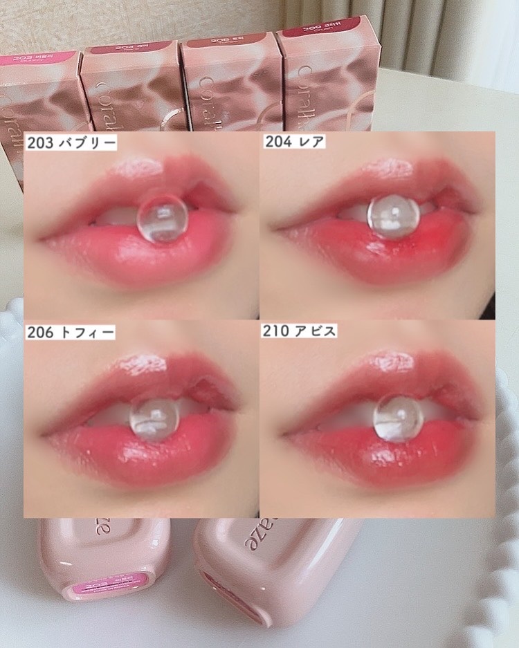 - <201 フェアリー> ダイマージリノール酸ジイソステアリル、ジフェニルシロキシフェニルトリメチコン、ビスジグリセリルポリアシルアジペート-2、水、ジフェニルジメチコン、水添ポリイソブテン、セチルPEG/PPG-10/1ジメチコン、ポリソルベート60、ペンチレングリコール、グリセリン、イソステアリン酸ポリグリセリル-4、フェノキシエタノール、1,2-ヘキサンジオール、セテアレス-20、酸化チタン (CI 77891)、(アクリル酸ヒドロキシエチル/アクリロイルジメチルタウリンNa)コポリマー、ステビオシド、スクワラン、香料、ジラウラミドグルタミドリシンNa、エチルヘキシルグリセリン、エチレンジアミンジコハク酸3Na、赤色227号 (CI 17200)、水酸化Al、黄色5号 (CI 15985)、ポリアクリル酸アンモニウム、イソステアリン酸ソルビタン、黄色4号 (CI 19140)、BG、赤色223号 (CI 45410)、青色1号 (CI 42090)、アラントイン、パンテノール、ツボクサエキス、ヒアルロン酸、加水分解ヒアルロン酸、ヒアルロン酸Na <203 バブリー> ダイマージリノール酸ジイソステアリル、ジフェニルシロキシフェニルトリメチコン、ビスジグリセリルポリアシルアジペート-2、水、ジフェニルジメチコン、水添ポリイソブテン、セチルPEG/PPG-10/1ジメチコン、ポリソルベート60、ペンチレングリコール、グリセリン、イソステアリン酸ポリグリセリル-4、フェノキシエタノール、1,2-ヘキサンジオール、セテアレス-20、(アクリル酸ヒドロキシエチル/アクリロイルジメチルタウリンNa)コポリマー、ステビオシド、酸化チタン (CI 77891)、スクワラン、香料、ジラウラミドグルタミドリシンNa、エチルヘキシルグリセリン、赤色227号 (CI 17200)、エチレンジアミンジコハク酸3Na、黄色5号 (CI 15985)、イソステアリン酸ソルビタン、水酸化Al、ポリアクリル酸アンモニウム、黄色4号 (CI 19140)、BG、青色1号 (CI 42090)、アラントイン、パンテノール、ツボクサエキス、ヒアルロン酸、加水分解ヒアルロン酸、ヒアルロン酸Na <204 レア> ダイマージリノール酸ジイソステアリル、ジフェニルシロキシフェニルトリメチコン、ビスジグリセリルポリアシルアジペート-2、水、ジフェニルジメチコン、水添ポリイソブテン、セチルPEG/PPG-10/1ジメチコン、ポリソルベート60、ペンチレングリコール、グリセリン、イソステアリン酸ポリグリセリル-4、フェノキシエタノール、1,2-ヘキサンジオール、セテアレス-20、(アクリル酸ヒドロキシエチル/アクリロイルジメチルタウリンNa)コポリマー、酸化チタン (CI 77891)、ステビオシド、スクワラン、香料、ジラウラミドグルタミドリシンNa、エチルヘキシルグリセリン、赤色227号 (CI 17200)、黄色5号 (CI 15985)、エチレンジアミンジコハク酸3Na、イソステアリン酸ソルビタン、水酸化Al、ポリアクリル酸アンモニウム、黄色4号 (CI 19140)、青色1号 (CI 42090)、BG、アラントイン、パンテノール、ツボクサエキス、ヒアルロン酸、加水分解ヒアルロン酸、ヒアルロン酸Na <205 ハニーデュー> ダイマージリノール酸ジイソステアリル、ジフェニルシロキシフェニルトリメチコン、ビスジグリセリルポリアシルアジペート-2、水、ジフェニルジメチコン、水添ポリイソブテン、セチルPEG/PPG-10/1ジメチコン、ポリソルベート60、ペンチレングリコール、グリセリン、イソステアリン酸ポリグリセリル-4、フェノキシエタノール、1,2-ヘキサンジオール、セテアレス-20、(アクリル酸ヒドロキシエチル/アクリロイルジメチルタウリンNa)コポリマー、酸化チタン (CI 77891)、ステビオシド、スクワラン、香料、ジラウラミドグルタミドリシンNa、エチルヘキシルグリセリン、赤色227号 (CI 17200)、黄色5号 (CI 15985)、エチレンジアミンジコハク酸3Na、イソステアリン酸ソルビタン、水酸化Al、ポリアクリル酸アンモニウム、黄色4号 (CI 19140)、青色1号 (CI 42090)、BG、アラントイン、パンテノール、ツボクサエキス、ヒアルロン酸、加水分解ヒアルロン酸、ヒアルロン酸Na <206 トフィー> ダイマージリノール酸ジイソステアリル、ジフェニルシロキシフェニルトリメチコン、ビスジグリセリルポリアシルアジペート-2、水、ジフェニルジメチコン、水添ポリイソブテン、セチルPEG/PPG-10/1ジメチコン、ポリソルベート60、ペンチレングリコール、グリセリン、イソステアリン酸ポリグリセリル-4、フェノキシエタノール、1,2-ヘキサンジオール、セテアレス-20、(アクリル酸ヒドロキシエチル/アクリロイルジメチルタウリンNa)コポリマー、ステビオシド、スクワラン、香料、ジラウラミドグルタミドリシンNa、酸化チタン (CI 77891)、エチルヘキシルグリセリン、黄色5号 (CI 15985)、エチレンジアミンジコハク酸3Na、黄色4号 (CI 19140)、赤色227号 (CI 17200)、イソステアリン酸ソルビタン、赤色223号 (CI 45410)、青色1号 (CI 42090)、水酸化Al、ポリアクリル酸アンモニウム、BG、アラントイン、パンテノール、ツボクサエキス、ヒアルロン酸、加水分解ヒアルロン酸、ヒアルロン酸Na <207 フレイム> ダイマージリノール酸ジイソステアリル、ジフェニルシロ
