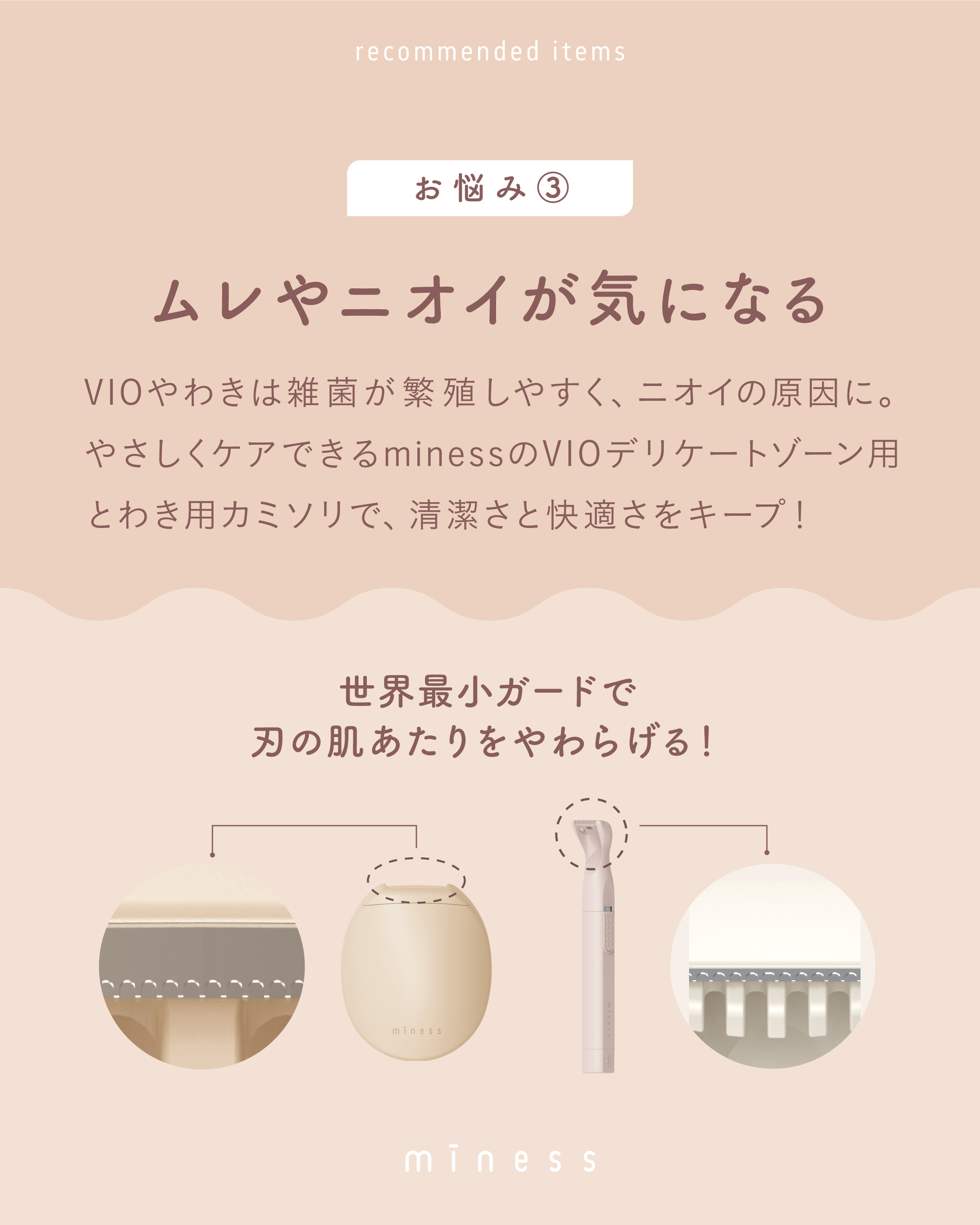 アンダーヘアのケア、どうしてる?👀人気の形やそれぞれのメリットをご紹介します🌼自分に合ったスタイルで、快適なケアを楽しんでくださいね✨アンダーヘアのケアにおすすめな、minessVIOデリケートゾーン用カミソリは🌼全そり用と毛量調整用の2種類...