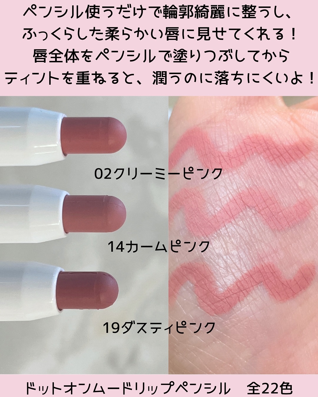 | どのカラーも馴染みがよくて、一度の塗布でしっかりめにカラーがのってぷっくり感を演出してくれる気がする🩷 | 詳細を見る | ||