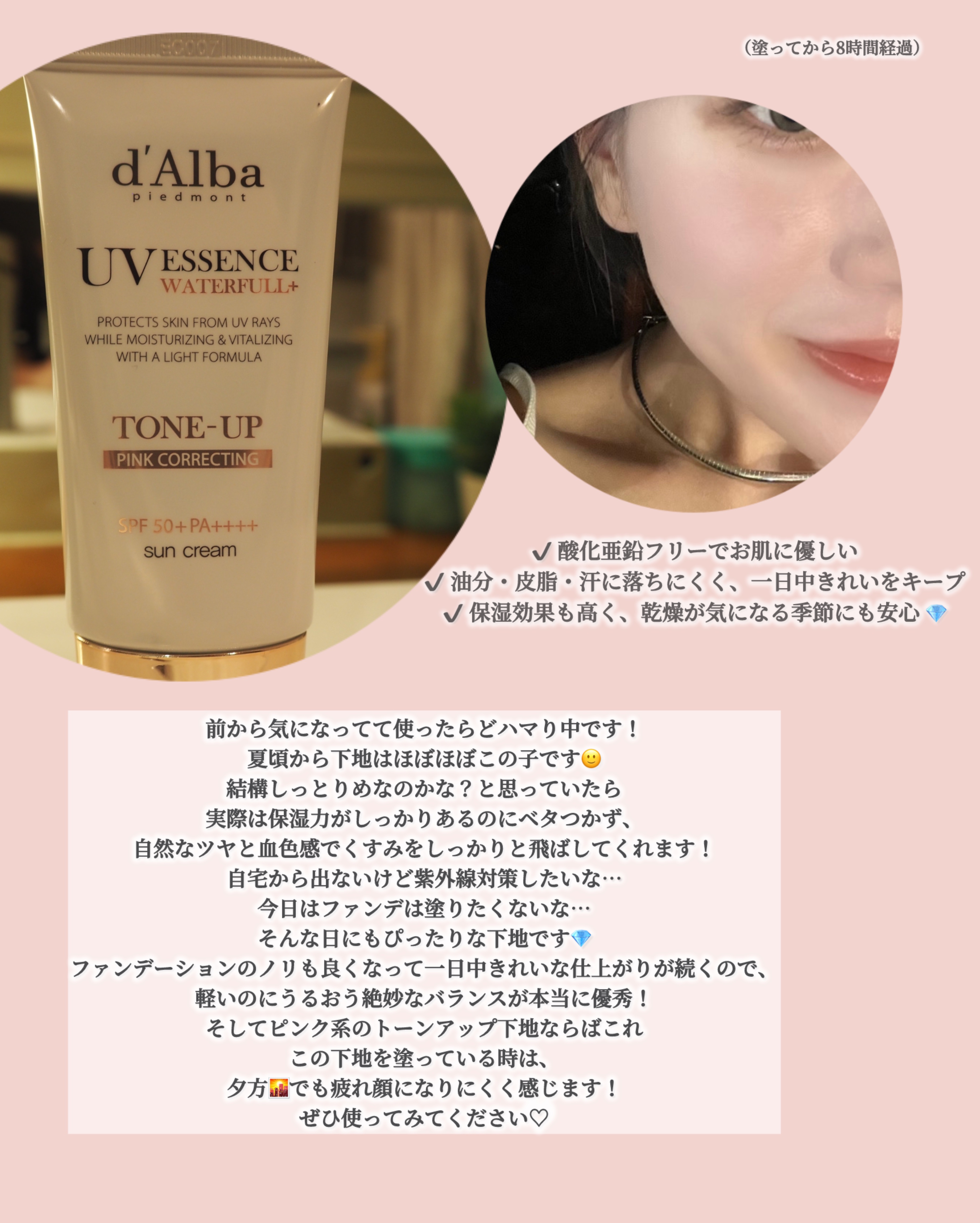 d'Albaダルバ ウォータフルトーンアップUVエッセンス(UV下地)SPF50+PA++++くすみが気になる方向け、トーンアップできるピンクのUV下地です。みずみずしいテクスチャーで、乾燥を防ぎます。毛穴も隠せて、伸びがいい。私が持っている...