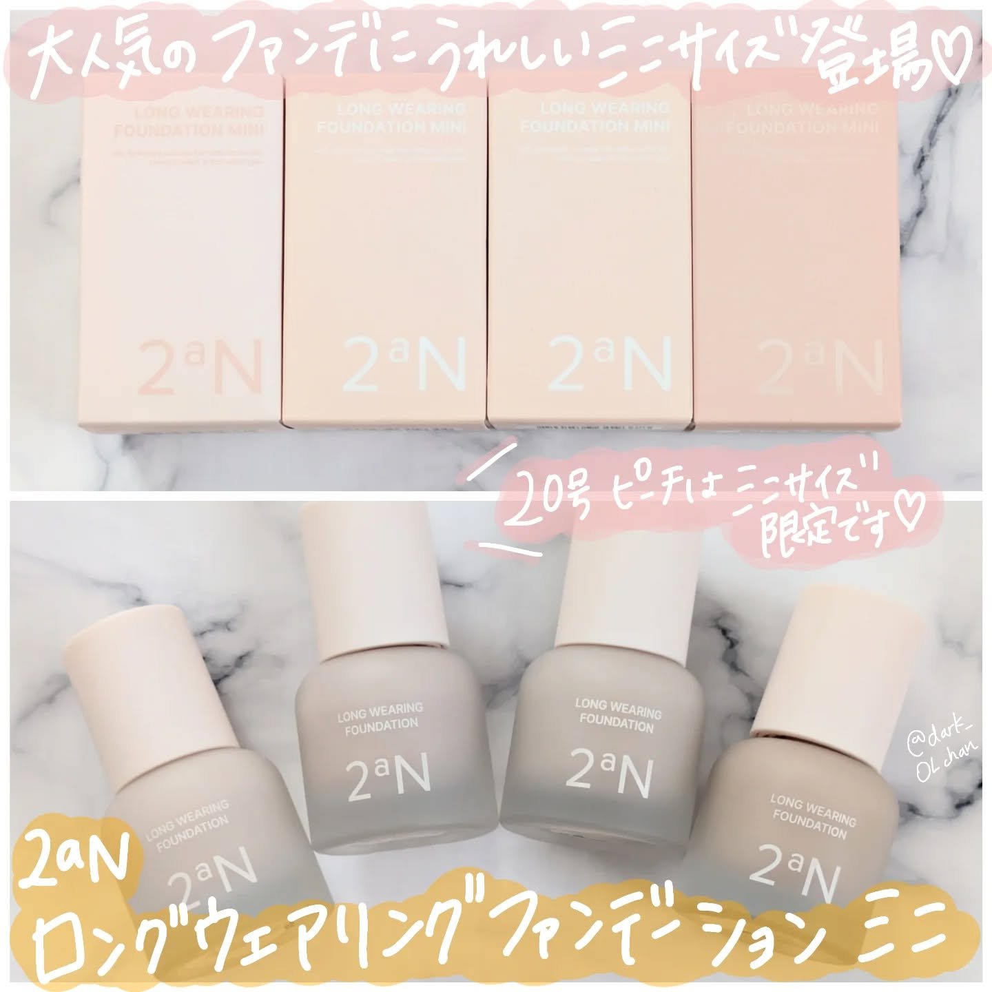 2aNさまからいただきました。ロングウェアリングファンデーションミニ4種・19号ペールベージュ・20号ピーチ(ミニ限定)・21号アイボリー・23号ナチュラルベージュセミマットタイプのファンデーション。すっと軽やかに伸びて、密着感も◎ミニサイズ...