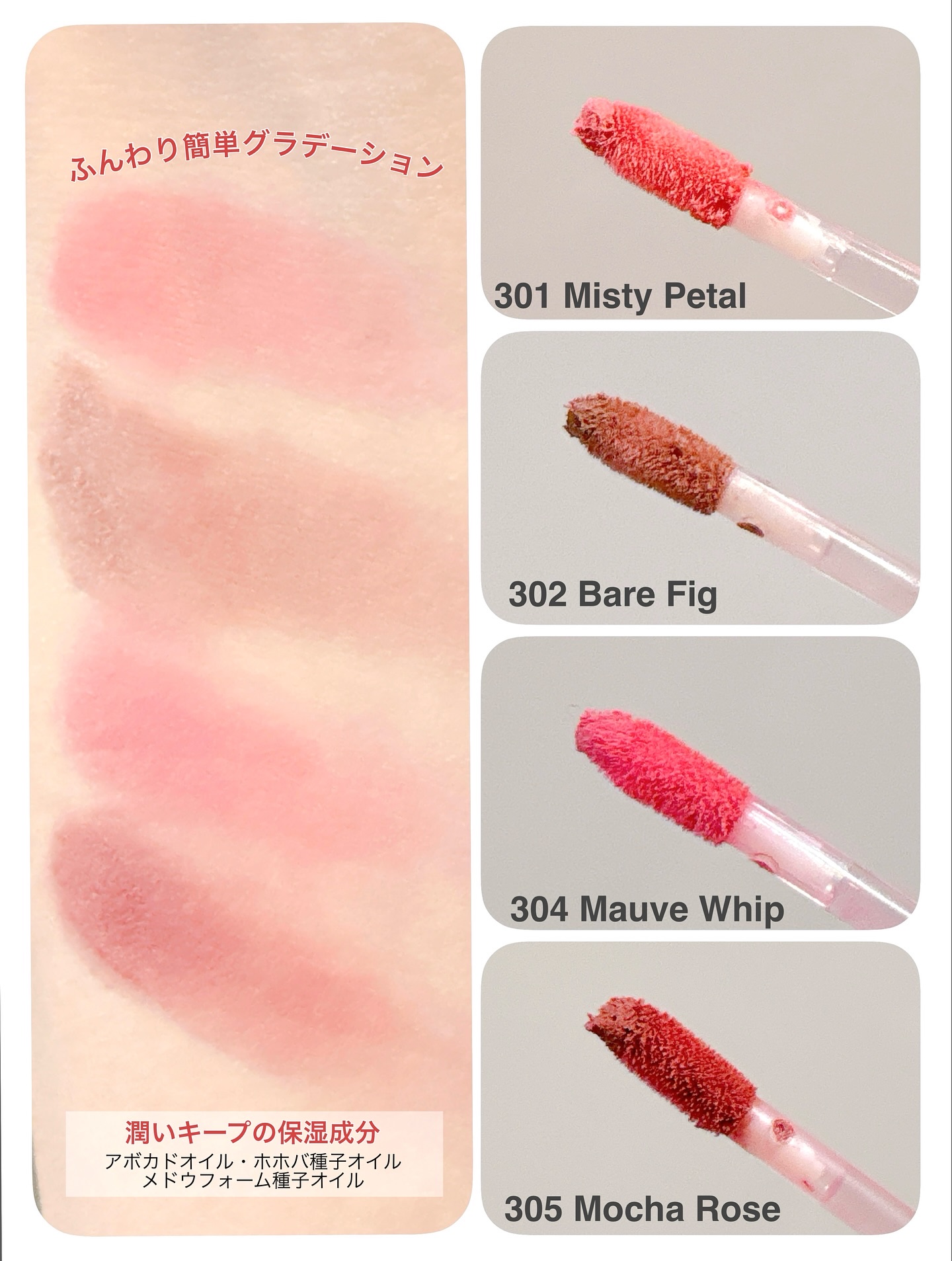 - -「ティント処方」でつけたての色をキープ。 - 少量でも唇全体がふんわりブラーリングされたような仕上がり。 - 乾燥しにくいマット質感で、角質浮きしにくいなめらかなテクスチャー。 - 無香料・パラベン不使用・動物由来成分不使用。