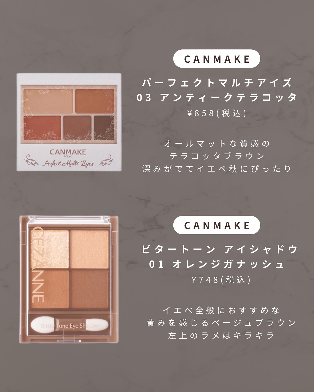 アイシャドウはマットカラー多めで落ち着きがあると思いきや、 左上のキラキラがとっても綺麗で一気におしゃれ見えする🤎✨ プチプラとは思えない質感と発色でとっても使いやすいよ☺️ チークは落ち着いたブラウンローズカラーで大人っぽい リップはほんのり赤みを感じるブラウンで透け感もあるよ🤍 ティント並みと色もちの良さ!というほどではないけど 食事とかしなければ色もちは良い🥰 ただ、なめらかなテクスチャーでしっとり感もあるんだけど わたしは長時間つけていると少し乾燥する気がしたのでその辺は個人差があるかも🙏 どのカラーもとっても可愛くておすすめだよ🫶💓