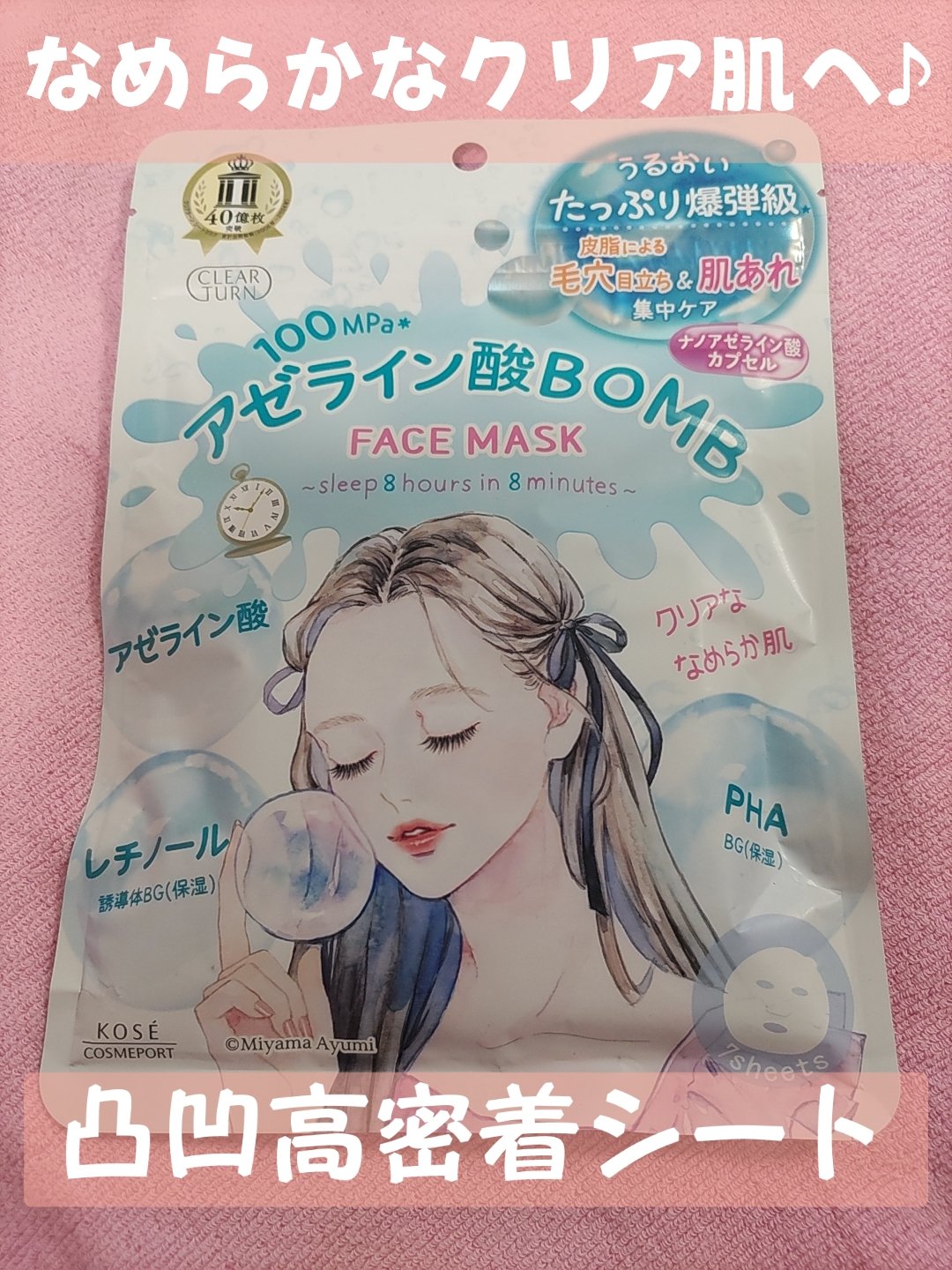 - 大人気の「クリアターン」イラストシリーズから 皮脂による毛穴目立ち・肌あれ*1をケアする『アゼライン酸BOMBマスク』が新発売✨ アゼライン酸・レチノール誘導体・BG(全て保湿)配合。 たっぷり爆弾級*2のうるおいで、皮脂トラブルが気になる肌も、素肌バランスをととのえ、クリアななめらか肌へ。 *1肌あれを防ぐこと *2はじけるようなうるおいのある使用感のこと