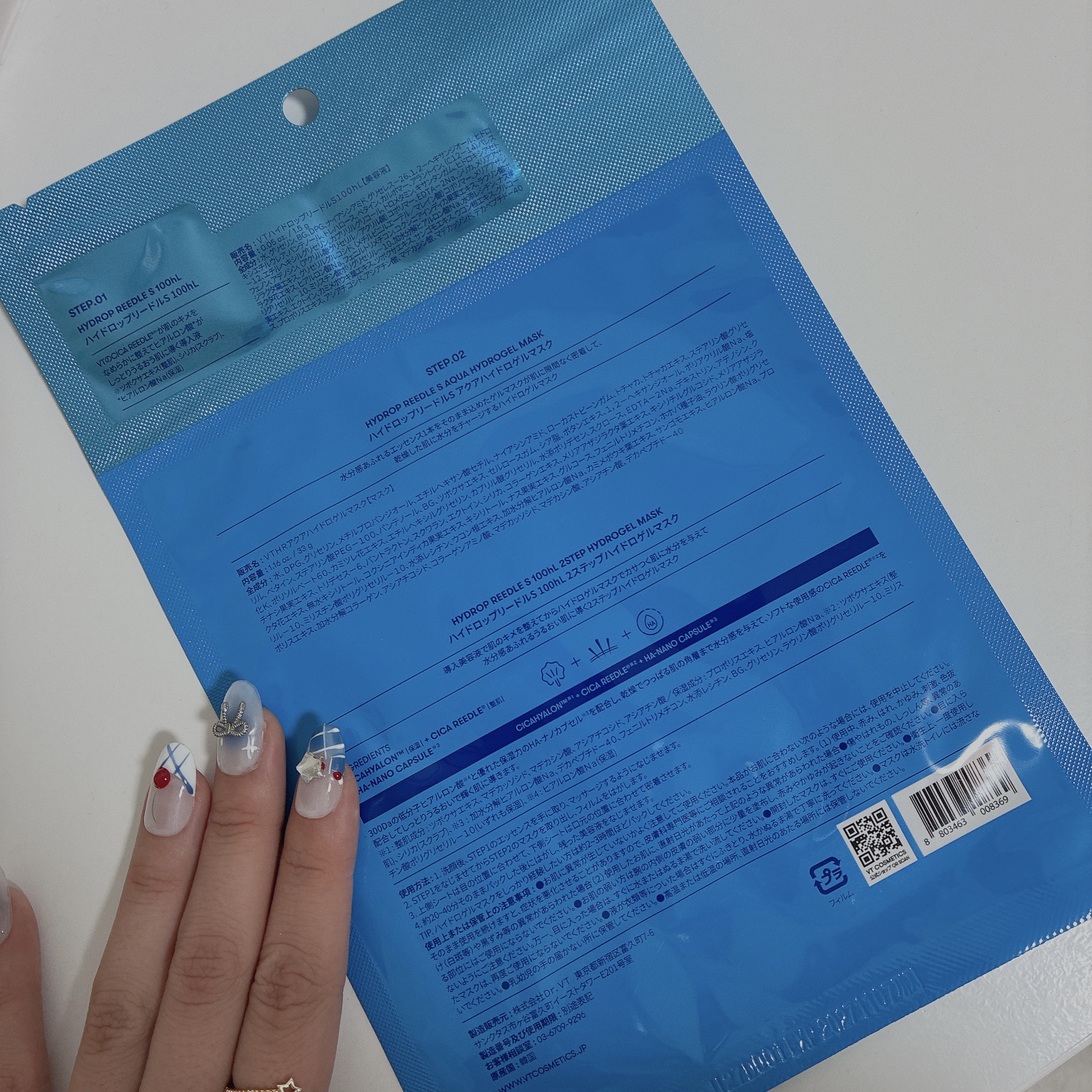 - [step 1: ハイドロップ リードルショット 100hL] 水、グリセリン、BG、DPG、ナイアシンアミド、グリセレス-26、1,2-ヘキサンジオール、ヒドロキシエチルウレア、パンテノール、トレハロース、ベタイン、カルボマー、アラントイン、(C12-14)パレス-12、エチルヘキシルグリセリン、カプリリルグリコール、トロメタミン、キサンタンガム、ヒドロキシアセトフェノン、アデノシン、(アクリル酸グリセリル/アクリル酸)コポリマー、EDTA-2Na、シリカ、メリアアザジラクタ葉エキス、グリセリルグルコシド、(メチルビニルエーテル/マレイン酸)コポリマー、メリアアザジラクタ花エキス、ヒアルロン酸Na、フェニルトリメチコン、コクシニアインディカ果実エキス、ラウリン酸ポリグリセリル-10、ミリスチン酸ポリグリセリル-10、加水分解ヒアルロン酸Na、水添レシチン、ナス果実エキス、エクトイン、カミメボウキ葉エキス、ツボクサエキス、サンゴモエキス、ウコン根エキス、グルコース、プロポリスエキス、アシアチコシド、アシアチン酸、マデカシン酸、マデカッソシド、デカペプチド-40 [step 2 : ハイドロップ リードルショット アクアハイドロゲルマスク] 水、DPG、グリセリン、メチルプロパンジオール、エチルヘキサン酸セチル、ナイアシンアミド、ローカストビーンガム、トチャカ、トチャカエキス、ステアリン酸グリセリル、ベタイン、ステアリン酸PEG-100、パンテノール、BG、ツボクサエキス、セルロースガム、シア脂、ボタンエキス、1,2-ヘキサンジオール、ポリアクリル酸Na、塩化K、ポリソルベート60、カミツレ花エキス、エチルヘキシルグリセリン、カプリル酸グリセリル、水添ポリデセン、スクロース、EDTA-2Na、デキストリン、アデノシン、クチナシ果実エキス、トリデセス-6、パントラクトン、スクワラン、エクトイン、シリカ、コラーゲンエキス、メリアアザジラクタ葉エキス、キシリチルグルコシド、メリアアザジラクタ花エキス、無水キシリトール、コクシニアインディカ果実エキス、キシリトール、ナス果実エキス、グルコース、フェニルトリメチコン、ホホバ種子油、ラウリン酸ポリグリセリル-10、ミリスチン酸ポリグリセリル-10、水添レシチン、ウコン根エキス、加水分解ヒアルロン酸Na、カミメボウキ葉エキス、サンゴモエキス、ヒアルロン酸Na、プロポリスエキス、加水分解コラーゲン、アシアチコシド、コラーゲンアミノ酸、マデカッソシド、マデカシン酸、アシアチン酸、デカペプチド-40