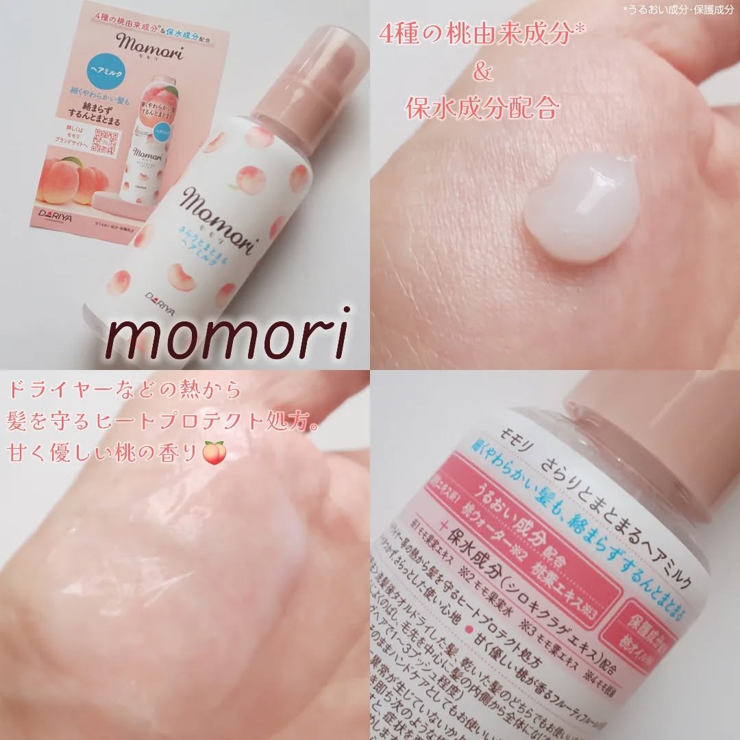 モモリさまからいただきました♡momoriさらりとまとまるヘアミルク115ml\柔らかい・細い髪、からまりやすい髪に/4種の桃由来成分(うるおい成分・保護成分)と保水成分を配合🩷☑︎ヒートプロテクト処方☑︎甘く優しい桃が香るフルーティフルール...