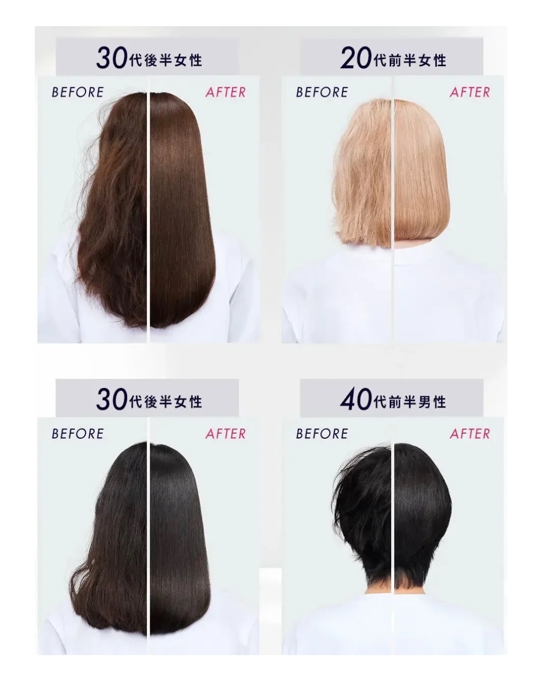 - <シャンプー> 水、コカミドプロピルベタイン、ラウラミドDEA、ラウリルグリコール酢酸Na、ココイル加水分解ケラチンK(羊毛)、ココイルメチルタウリンNa、ココイルグリシンNa、グリチルリチン酸2K、アラントイン、加水分解ケラチン(カシミヤヤギ)、加水分解ケラチン(羊毛)、加水分解シルク、ジマレイン酸プロピレンジアンモニウム、アミノエチルチオコハク酸ジアンモニウム、シスチン、グルタミン酸、アルギニン、リシンHCl、トレオニン、セリン、プロリン、ロイシン、バリン、アスパラギン酸、イソロイシン、グリシン、アラニン、フェニルアラニン、ヒスチジンHCl、メチオニン、トリプトファン、ヒドロキシプロピルトリモニウム加水分解ケラチン(羊毛)、(ジヒドロキシメチルシリルプロポキシ)ヒドロキシプロピル加水分解ケラチン(羊毛)、ココジモニウムヒドロキシプロピル加水分解ケラチン(羊毛)、イソステアロイル加水分解ケラチン(羊毛)、ケラチン、セラミドNP、セラミドNG、セラミドAP、セラミドEOP、セラミドAG、セテアラミドエチルジエトニウム加水分解コメタンパク、ラノリン脂肪酸、γ-ドコサラクトン、スイゼンジノリ多糖体、ヒスチジン、フィトステロールズ、PCA-Na、トリ(カプリル酸/カプリン酸)グリセリル、水添レシチン、グリセリン、BG、タウリン、ヤシ油脂肪酸PEG-7グリセリル、ポリクオタニウムー7、ポリクオタニウムー10、ヒドロキシプロピルシクロデキストリン、エチドロン酸、クエン酸、ブチルカルバミン酸ヨウ化プロピニル、エチドロン酸4Na、EDTA-4Na、イソノナン酸イソノニル、乳酸Na、ラウラミノプロピオン酸Na、PCA、塩化アンモニウム、香料、フェノキシエタノール <トリートメント> 水、セテアリルアルコール、アモジメチコン、ダイマージリノール酸水添ヒマシ油、BG、ベヘントリモニウムクロリド、加水分解シルク、加水分解ケラチン(カシミヤヤギ)、アミノエチルチオコハク酸ジアンモニウム、γ-ドコサラクトン、セテアラミドエチルジエトニウム加水分解コメタンパク、ラノリン脂肪酸、ジグルコシル没食子酸、ジマレイン酸プロピレンジアンモニウム、シスチン、グルタミン酸、アルギニン、リシンHCl、トレオニン、セラミドNG、セラミドAP、セラミドAG、セラミドNP、セラミドEOP、スイゼンジノリ多糖体、セリン、プロリン、ロイシン、バリン、アスパラギン酸、イソロイシン、グリシン、アラニン、フェニルアラニン、ヒスチジンHCl、メチオニン、トリプトファン、グリチルリチン酸2K、アラントイン、ヒドロキシプロピルトリモニウム加水分解ケラチン(羊毛)、(ジヒドロキシメチルシリルプロポキシ)ヒドロキシプロピル加水分解ケラチン(羊毛)、ココジモニウムヒドロキシプロピル加水分解ケラチン(羊毛)、イソステアロイル加水分解ケラチン(羊毛)、加水分解ケラチン(羊毛)、ケラチン、ヒスチジン、フィトステロールズ、PCA-Na、乳酸Na、ラウラミノプロピオン酸Na、PCA、クエン酸、ヒドロキシプロピルデンプンリン酸、イソプロパノール、トリ(カプリル酸/カプリン酸)グリセリル、グリセリン、イソノナン酸イソノニル、水添レシチン、タウリン、セトリモニウムクロリド、塩化アンモニウム、香料、フェノキシエタノール <シャンプー(詰め替え) 400mL> 水、コカミドプロピルベタイン、ラウラミドDEA、ラウリルグリコール酢酸Na、ココイル加水分解ケラチンK(羊毛)、ココイルメチルタウリンNa、ココイルグリシンNa、グリチルリチン酸2K、アラントイン、加水分解ケラチン(カシミヤヤギ)、加水分解ケラチン(羊毛)、加水分解シルク、ジマレイン酸プロピレンジアンモニウム、アミノエチルチオコハク酸ジアンモニウム、シスチン、グルタミン酸、アルギニン、リシンHCl、トレオニン、セリン、プロリン、ロイシン、バリン、アスパラギン酸、イソロイシン、グリシン、アラニン、フェニルアラニン、ヒスチジンHCl、メチオニン、トリプトファン、ヒドロキシプロピルトリモニウム加水分解ケラチン(羊毛)、(ジヒドロキシメチルシリルプロポキシ)ヒドロキシプロピル加水分解ケラチン(羊毛)、ココジモニウムヒドロキシプロピル加水分解ケラチン(羊毛)、イソステアロイル加水分解ケラチン(羊毛)、ケラチン、セラミドNP、セラミドNG、セラミドAP、セラミドEOP、セラミドAG、セテアラミドエチルジエトニウム加水分解コメタンパク、ラノリン脂肪酸、γ-ドコサラクトン、スイゼンジノリ多糖体、ヒスチジン、フィトステロールズ、PCA-Na、トリ(カプリル酸/カプリン酸)グリセリル、水添レシチン、グリセリン、BG、タウリン、ヤシ油脂肪酸PEG-7グリセリル、ポリクオタニウムー7、ポリクオタニウムー10、ヒドロキシプロピルシクロデキストリン、エチドロン酸、クエン酸、ブチルカルバミン酸ヨウ化プロピニル、エチドロン酸4Na、EDTA-4Na、イソノナン酸イソノニル、乳酸Na、ラウラミノプロピオン酸Na、PCA、塩化アンモニウム、香料、フェノキシエタノール <シャンプー 大容量詰め替え(1,000mL)> 水、コ