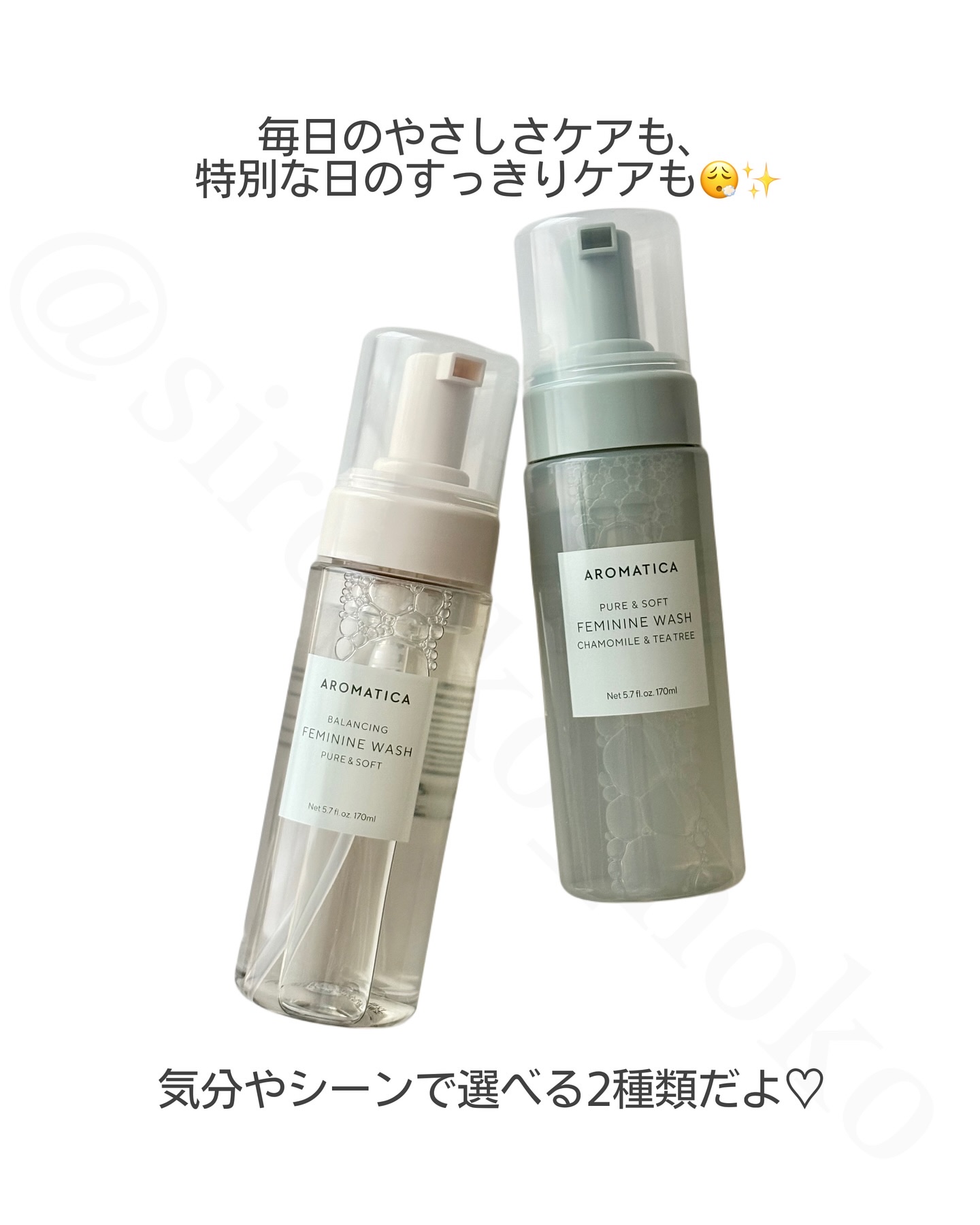 AROMATICA✔︎フェミニンウォッシュピュア&ソフト✔︎フェミニンウォッシュカモミール&ティーツリーお洒落な見た目でバスルームに置いても気分が上がるフェミニンウォッシュ🌿ワンプッシュでふわふわの泡が出てくるから、デリケートゾーンケア...