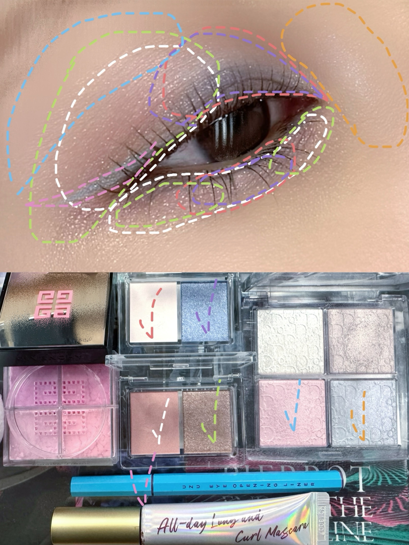ピンク部分はローズティーズの右上の右下をブレンド、ブルー部分はクアドリ11番の上2色をブレンド。 ラメは色んなシングルシャドウを上から重ねてます。 黒目上下はrom&ndのリキッドラメシャドウを使用。 マスカラにもシルバーのラメマスカラを使って全体的にキラキラ✨ セルフジェルネイルをピンクとブルーのラメにオーロラホロを乗せて氷っぽいイメージで仕上げたので、メイクも合わせてみました🥰