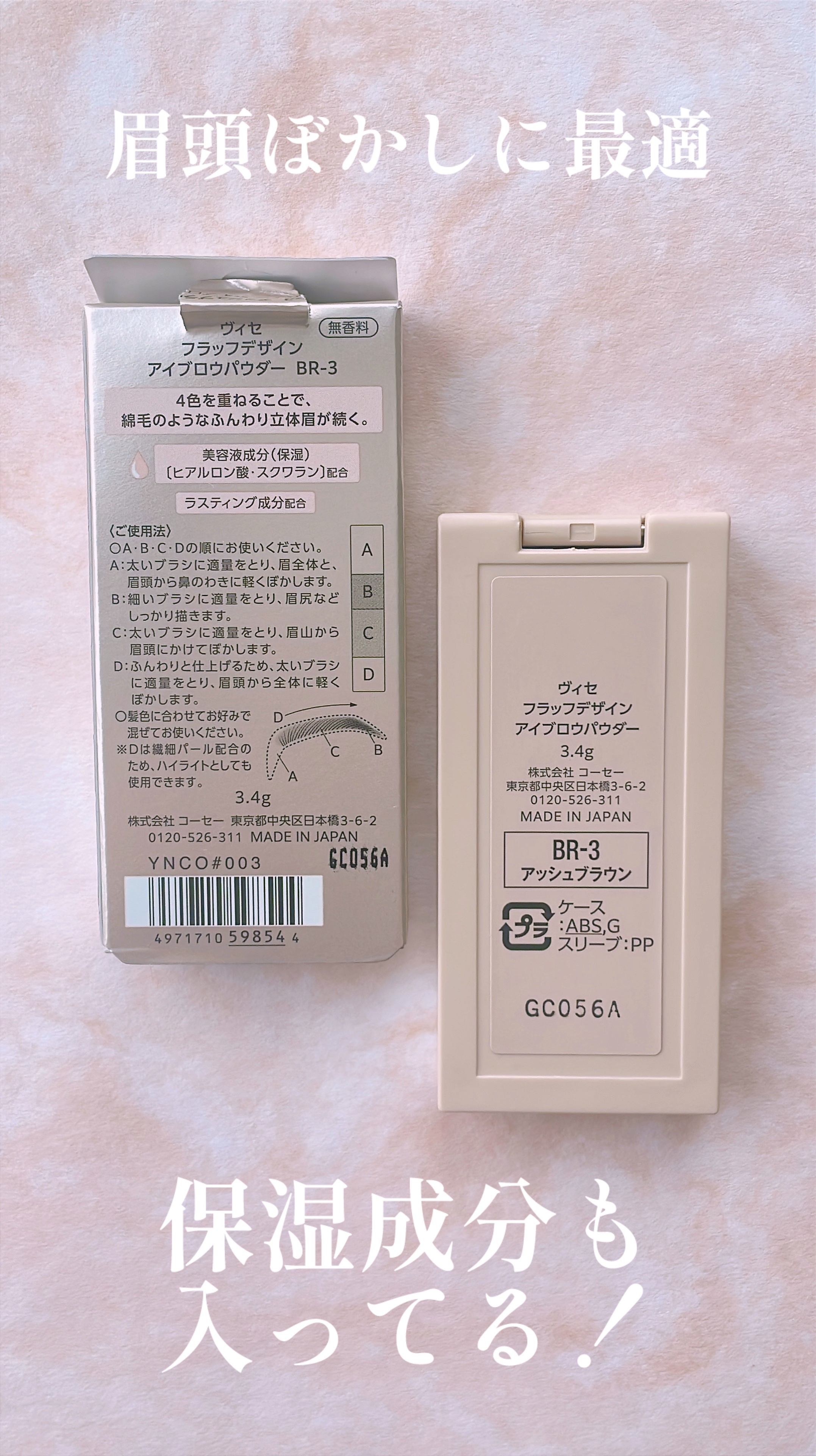 - 4色でふんわり抜け感眉に仕上げるアイブロウパウダー。 上の色から順に使うだけで、簡単にこなれ眉が完成。 BR-1 ライトブラウン:明るい黄みの髪色に BR-2 ブラウン:やや明るめ~やや暗めの髪色に BR-3 アッシュブラウン:黒髪や暗めの髪色に BR-4 ピンクブラウン:明るい赤みの髪色に