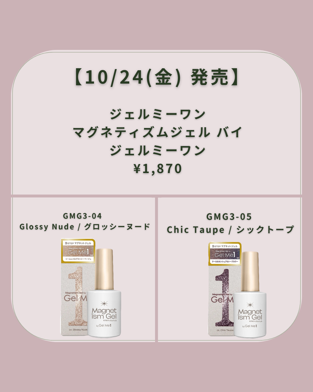- 〈数量限定〉 おうちで簡単にセルフジェルネイル。サロン級の仕上がりが叶う「ジェルミーワン」から、待望のマグネットジェルが全5色が登場! ”反発しても惹かれあい 離れない それは抗うことができない魅了する力ー”。 長持ち10日間*、ツヤ&ぷっくり感のジェルミーワンのクオリティはそのままに、’’マグネティズム’’をテーマにしたタイムレスな魅力を放つ指先へ。 *GM57 はがせるベース使用時。個人差があります。 2024年10月26日(土)ロフト・PLAZAにて先行発売 2024年11月1日(金)正午12時 コスメ・デ・ボーテ公式オンラインショップ発売 2024年11月9日(土)全国のバラエティ、ドラッグストア・一部オンラインストアにて順次発売 ※店舗によって販売開始日が異なる場合がございます。