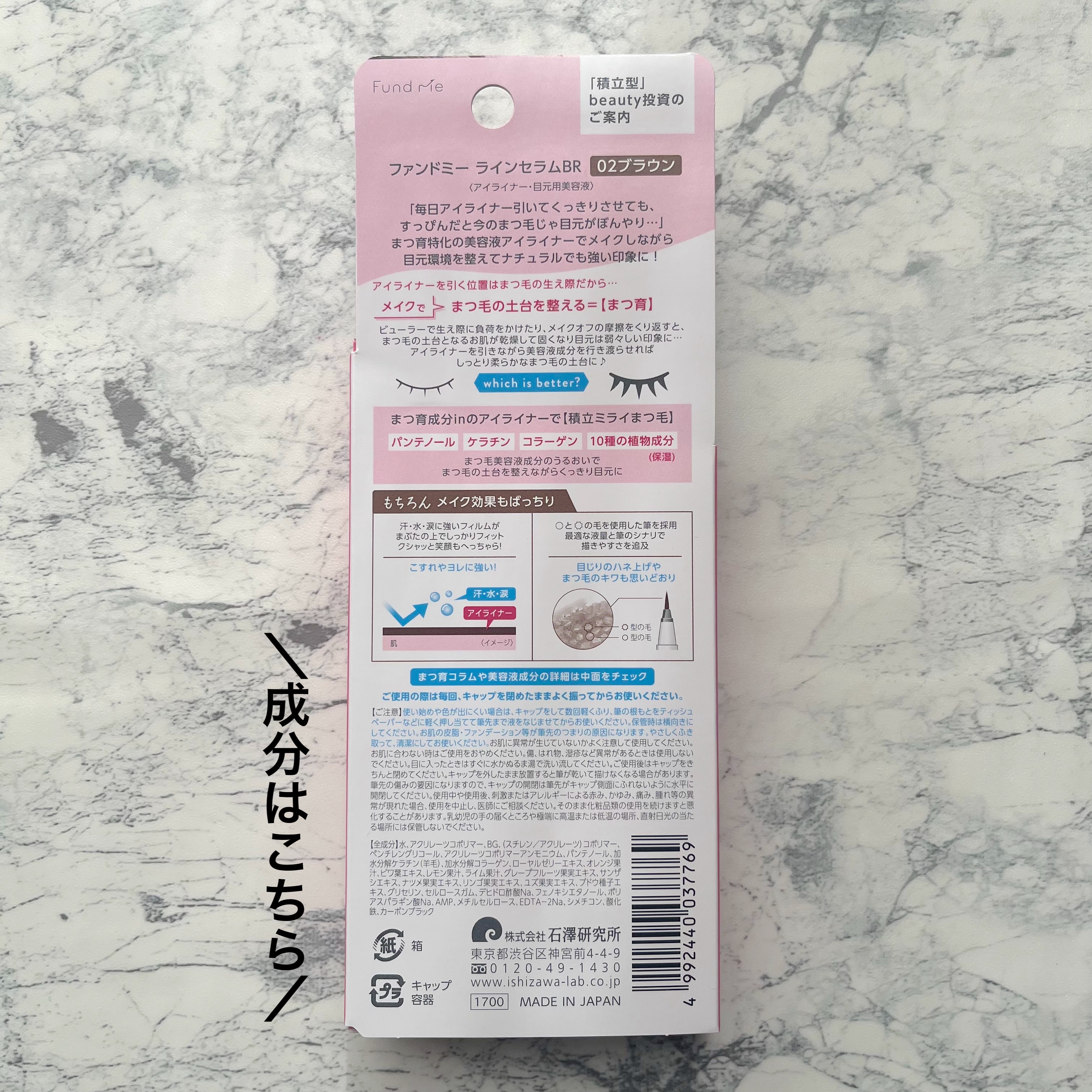 - まつ毛美容液でつくられたアイライナーです。まつ毛美容液成分のうるおいで、まつ毛の土台となる肌を整えながらくっきり目元に。 メイク効果もばっちり! 汗・水・涙に強いフィルムがまぶたの上でしっかりフィット。こすれやヨレに強いので、クシャッと笑顔もへっちゃら! 形の異なる2種類の毛を使用することで、最適な液量と筆のシナリを実現し、描きやすさを追及。目じりのハネ上げやまつ毛のキワも思いどおりにアイラインを引くことができます。 気分で選べる3色展開♪ コーディネートや気分によって選べる、嬉しい3色展開。 目元印象がバッチリな【01ブラック】。 目力はそのままに おしゃれな抜け感を演出する【02ブラウン】。 ザ・おしゃれな眼差し。 こなれ感を演出する【03バーガンディー】。 発売情報 2025年9月22日(月)以降順次、全国のロフトおよびロフトネットストアにて先行発売 2025年10月21日(火)全国のバラエティショップ、ECサイト、石澤研究所 公式通販発売 ※取扱い状況は店舗により異なります。一部店舗では発売日が前後する可能性がございます。お取り扱いや在庫状況は、直接店舗へお問い合わせください。