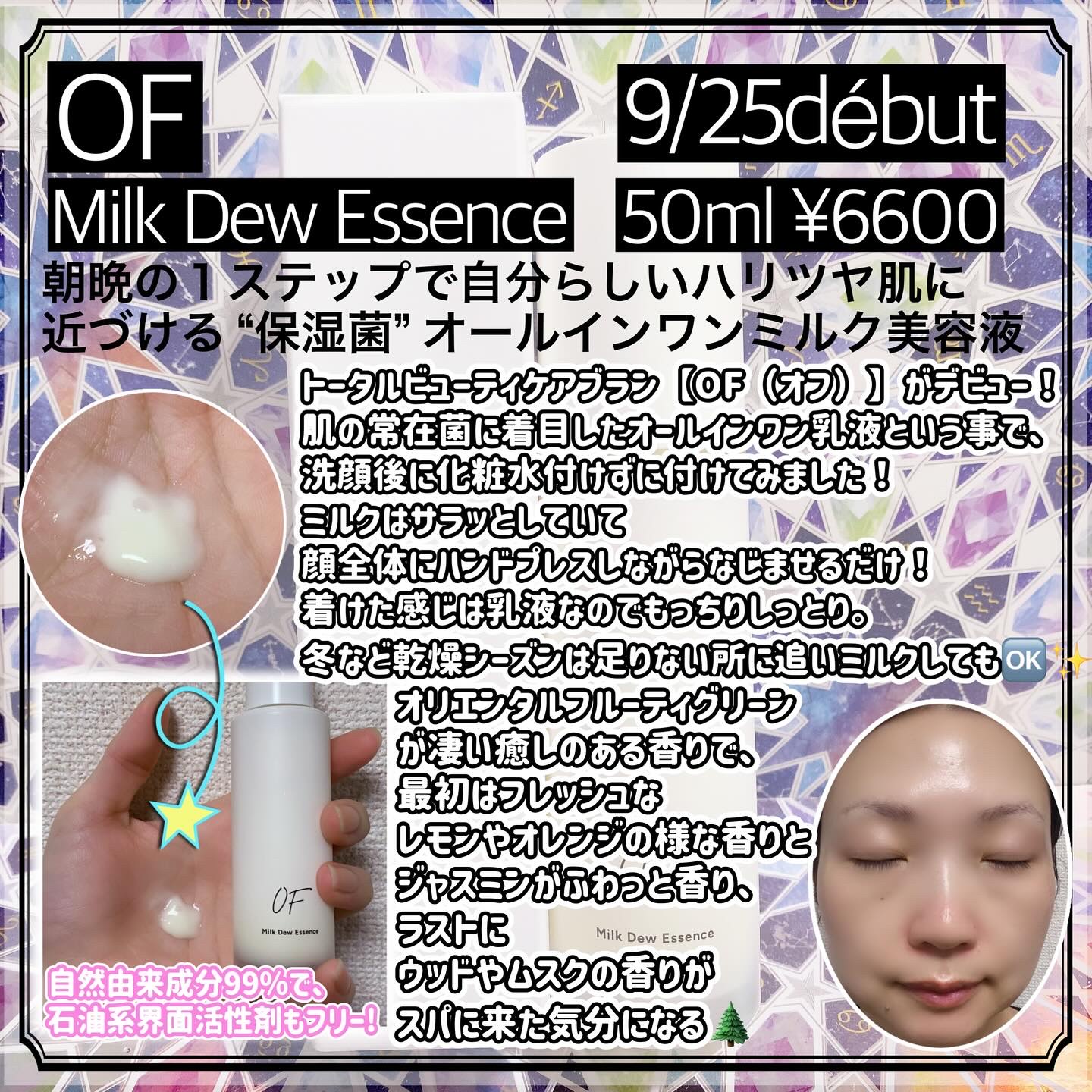 OF MilkDewEssence(オフミルクデューエッセンス)朝晩の1ステップで自分らしいハリツヤ肌に近づける“美肌菌”オールインワンミルク美容液“菌”の力でフラットな美しさを引き出す高機能美容液。肌の常在菌“マイクロバイオーム”に着目。そ...