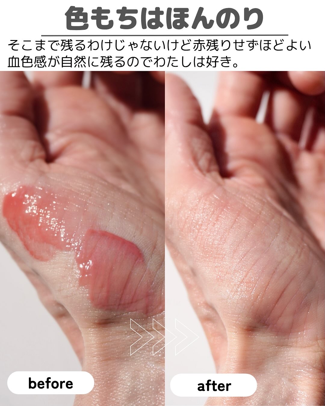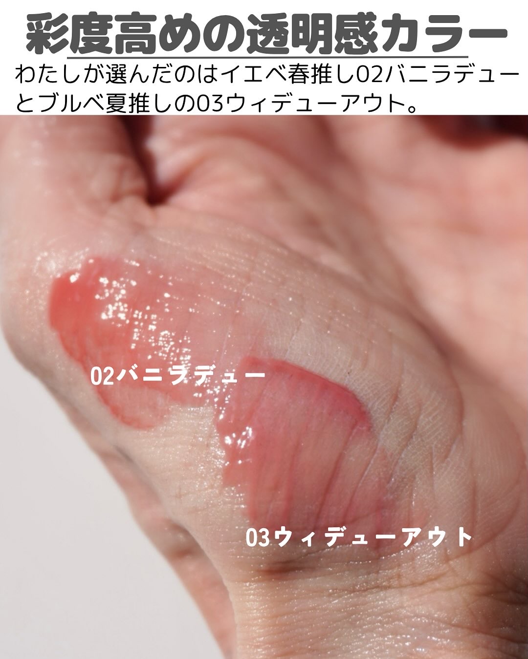 発色はけっこうよくて一度塗りでもしっかり色づく。 色持ちはティントじゃないからそこまでよくはないかな。 ツヤ感、透明感ありでどんなメイクの時にも使いやすい。 唇の血色悪い人はこの透明感で思ってたより発色しないかもしれない。 唇の血色いい人はヴィセの方が合ってそう。