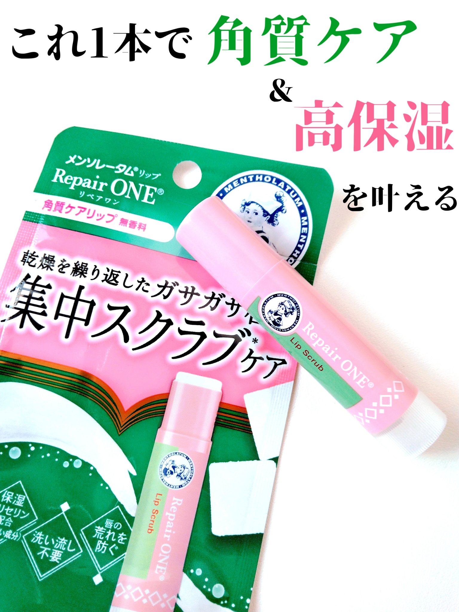 唇の皮剥けが気になり購入しました。スクラブの粒は大きくないので少しザラっとするぐらいです。通常のメンソレリップよりかは保湿されるように感じます。繰り出しタイプなので出し過ぎ注意です!戻りません!#メンソレータム#リペアワン角質ケアリップ#リッ...