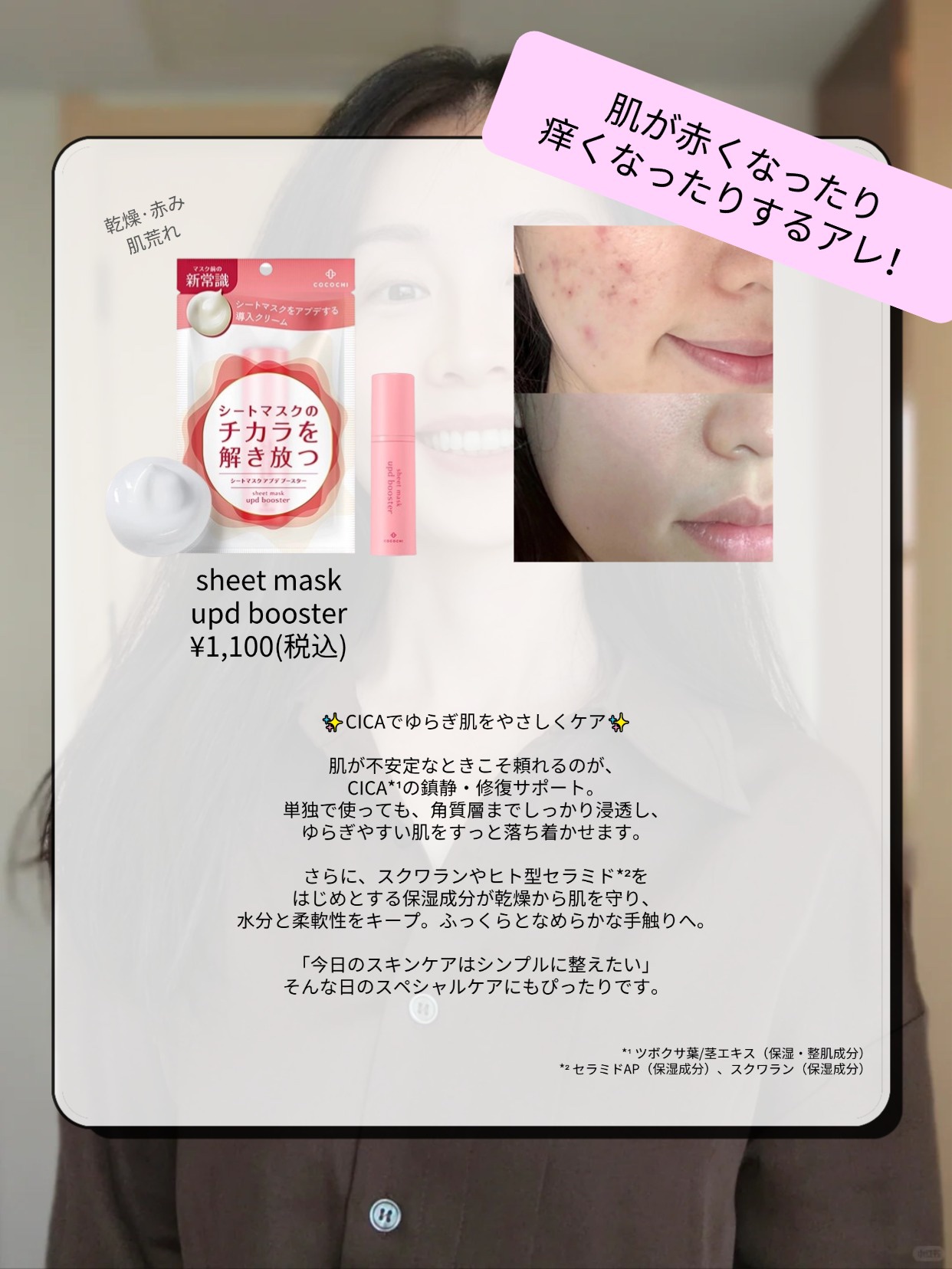 \シートマスク専用ブースターが登場?!/COCOCHIココチシートマスクアプデブースター15g(約15回分)参考価格1,100円(税込)シートマスク前に使用することで、肌を保湿しながら柔らかく整え、次に使用するシートマスクの受け入れ準備をする...