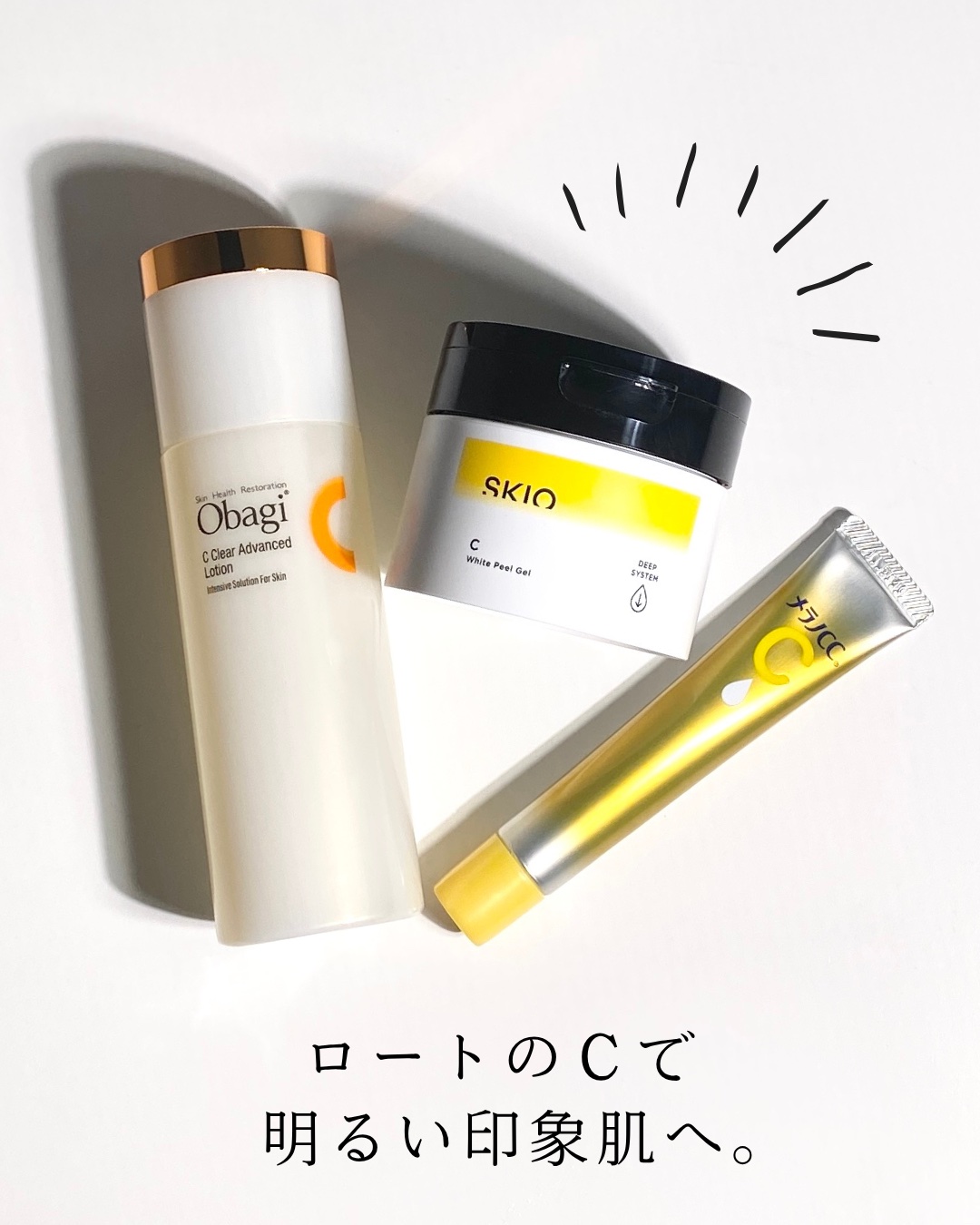 ・オバジオバジCクリアアドバンスドローション ・メラノCC薬用しみ集中対策プレミアム美容液・SKIOVCホワイトピールゲル\肌で働く、肌に効く。ロートのC/ビタミンCは、肌にうるおいを与え、健やかに保つために重要な成分のひとつピュアビタミンC...