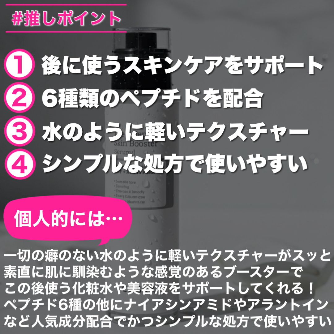 整肌成分である、6種類の多機能ペプチドが肌を健やかに保ってくれます✨ 肌の水分補給はもちろんのこと、弾力ケアや毛穴ケアまでできちゃう実力派ブースター👏 ベタつきもないから、次のスキンケアもすっと角質層まで浸透するような使用感が嬉しい💕