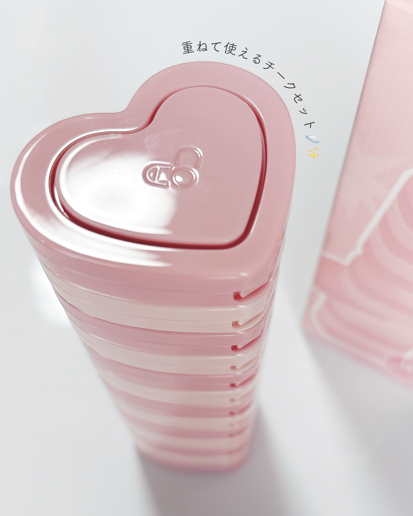 透け感がありじゅわっとした頬に😆 馴染みがよく量の調節がしやすい🫧 サテンマットとある通りほんのり艶は感じつつもベタつかずテクスチャーはしっとり✨ パッケージがハートなのも可愛いし、他のカラーと重ねて収納できるのも嬉しい🤗