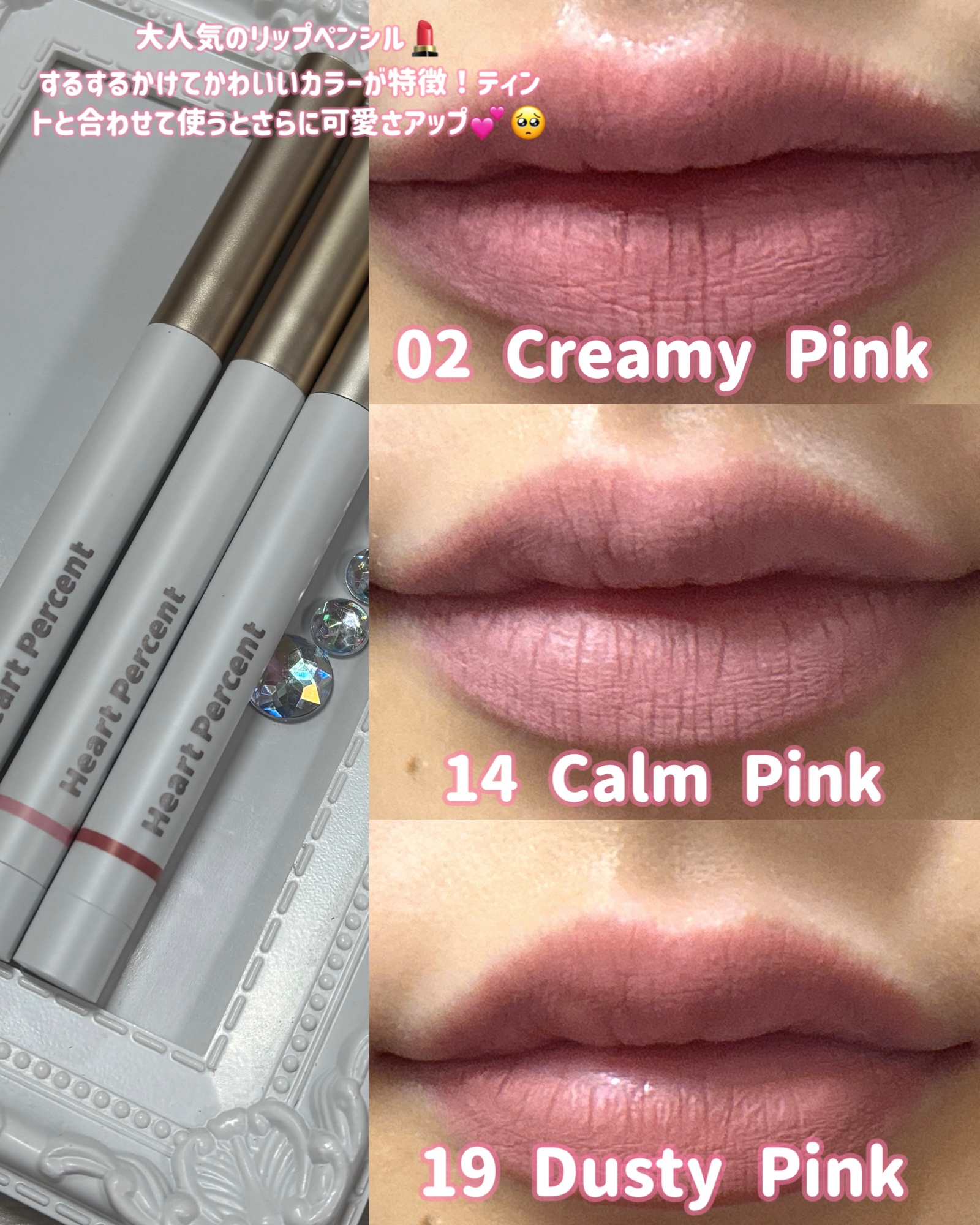 #PRHeartPercentドットオンムードリップペンシル🩷02CreamyPink🤍11SoftGlow🤎12CaramelBeige3つで綺麗なオーバーリップが出来るカラバリ!ぼかしやすいのに色持ちも良いのでお気に入りです⟡.·#ハート...