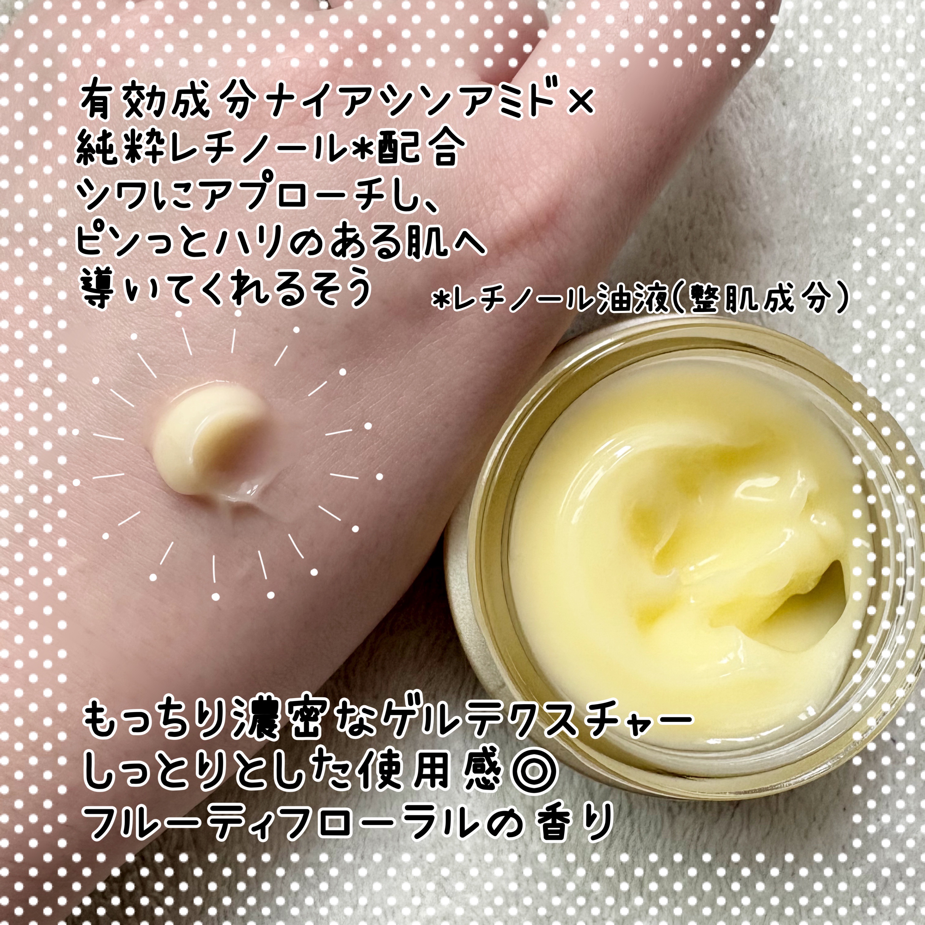 - 【医薬部外品】 (1)シワのメカニズム、肌本来の「バネ機能」の緩みに着目 年齢ともに減少し、ゆるんだバネのようになる真皮のコラーゲン。 そのコラーゲンを立て直す、独自のアプローチを開発。 (2)美容皮膚科学で推奨される3大美容成分配合 真皮のコラーゲン生成を促進し、シワを改善する「ナイアシンアミド*¹」に加え、 ハリ、弾力感を与える「純粋レチノール*²」と「浸透型コラーゲン*³」を配合。 (3)気になるシワの集中ケアも、全顔のハリ・弾力感ケアも みずみずしいゲルにクリームのようなコクをプラス。集中ケア効果の高いリッチなテクスチャー。 さらになめらかに伸びて負担をかけず、肌全体をケア。 浸透:角層 *1 有効成分 *2 レチノール油液(整肌成分) *3加水分解コラーゲン末(整肌成分) ※2025年8月18日〜順次パッケージリニューアル