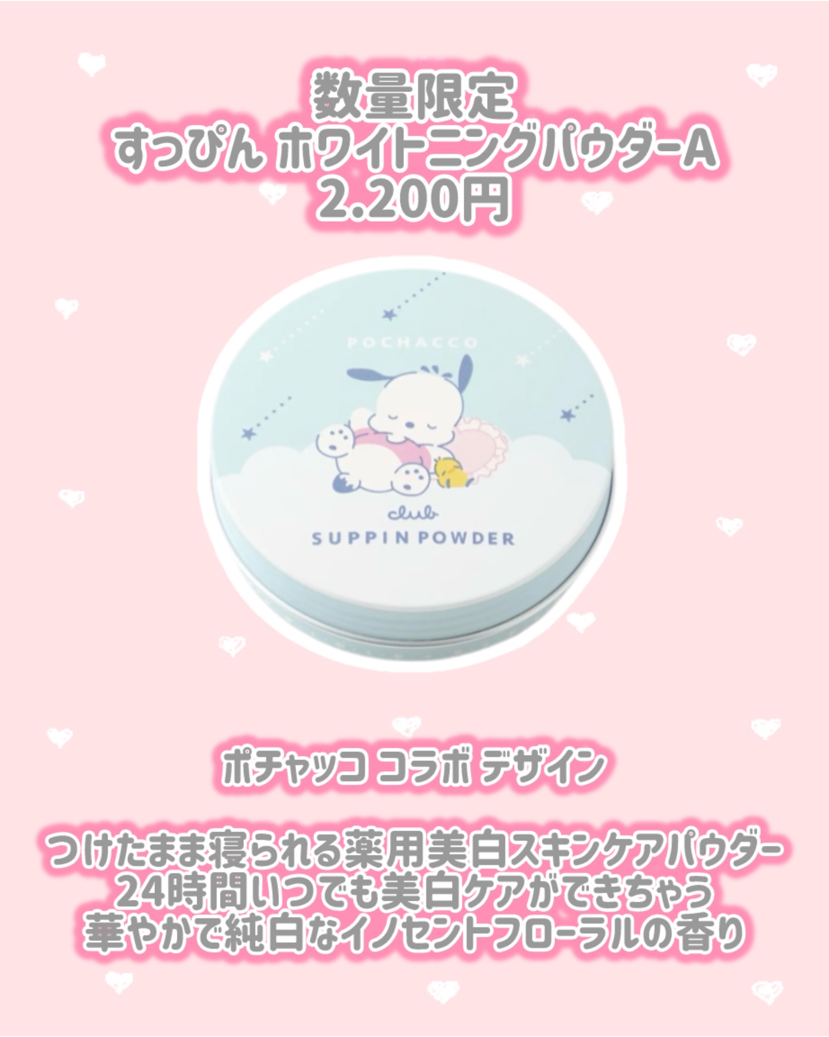 10/27販売開始!数量限定サンリオコラボ✼••┈┈••✼••┈┈••✼••┈┈••✼••┈┈••✼クラブすっぴんホワイトニングパウダーAポチャッココラボデザインすっぴんパウダーCホワイトフローラルブーケの香りハンギョドンコラボデザインすっぴ...