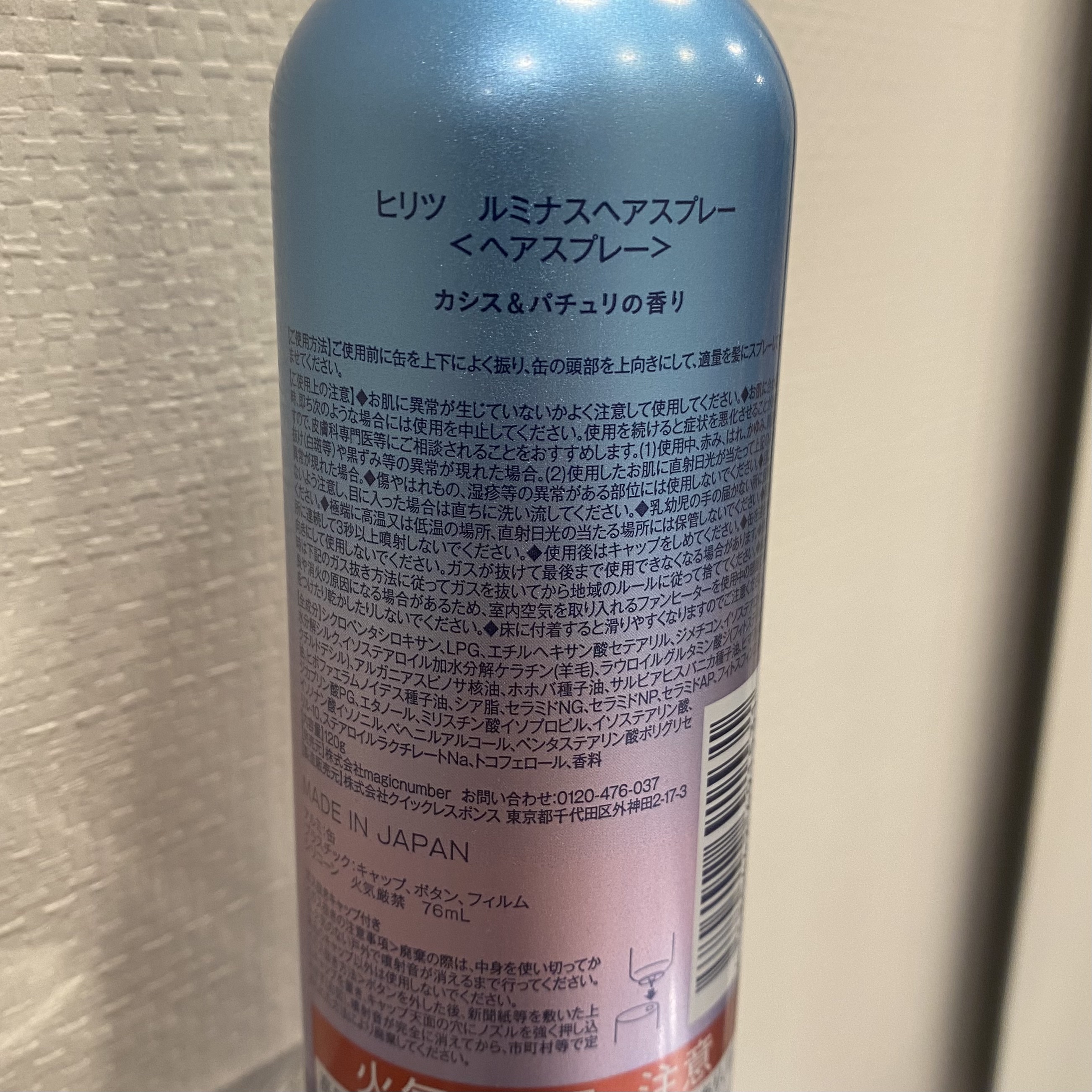 ヒリツ ルミナスヘアスプレーを使用させていただきました🙏可愛く綺麗な色味の容器で使用前から気分が上がります⤴︎持ち歩くのもコンパクトだし、使用するにも持ちやすい👌スプレー缶のまま洗面台付近に置いておいても可愛いなどオススメ点が使用前から沢山で...