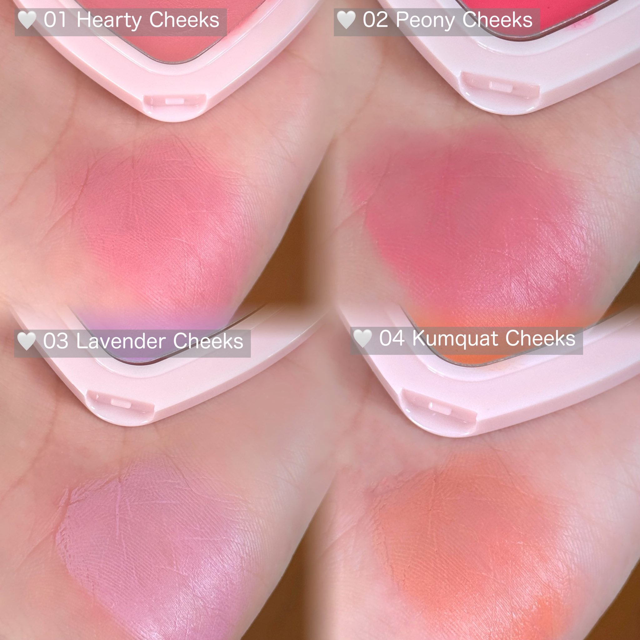 透け感がありじゅわっとした頬に😆 馴染みがよく量の調節がしやすい🫧 サテンマットとある通りほんのり艶は感じつつもベタつかずテクスチャーはしっとり✨ パッケージがハートなのも可愛いし、他のカラーと重ねて収納できるのも嬉しい🤗