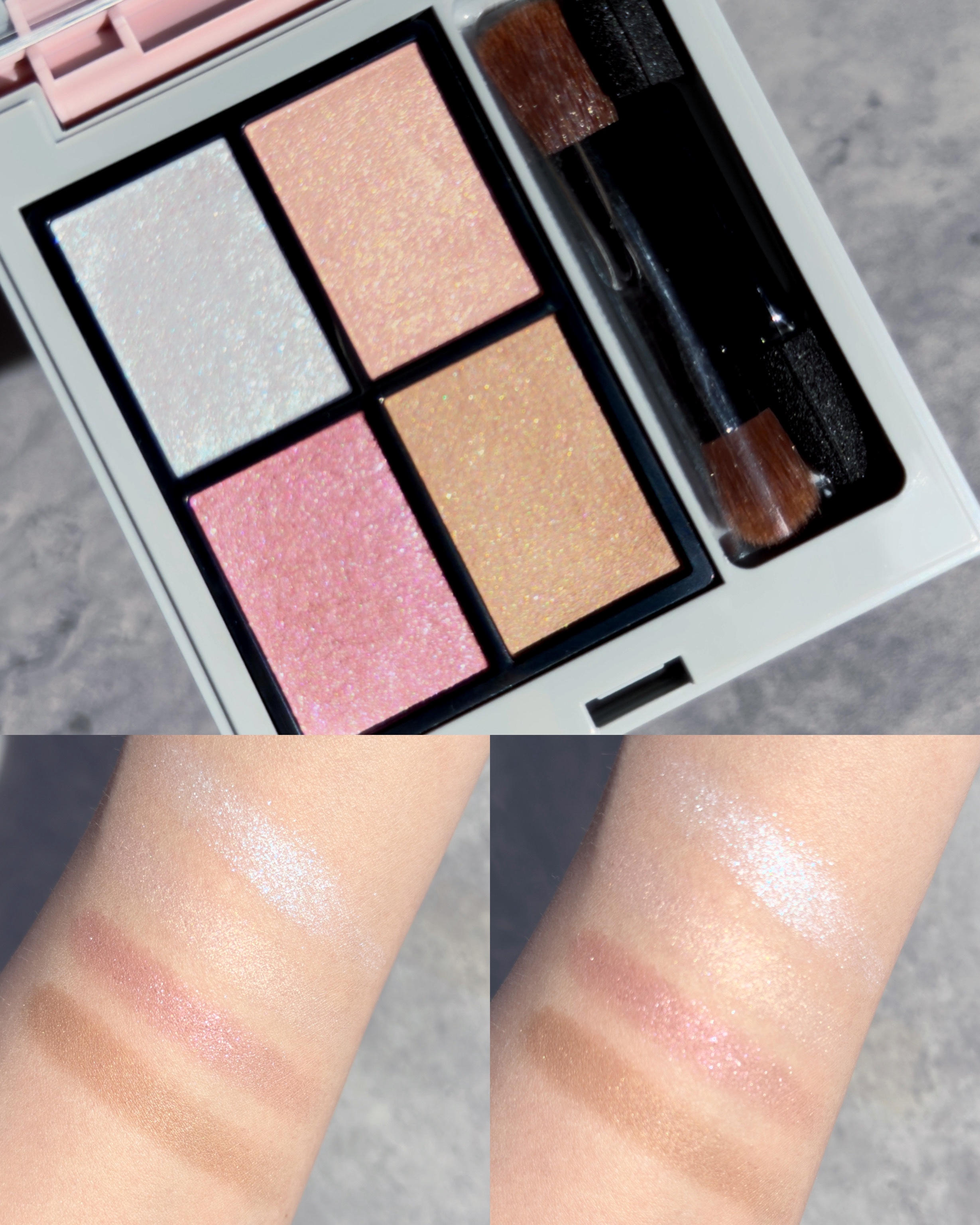 ケース別売り?ん?レフィル?? 自分でカスタムできるタイプになったみたい💡 メインカラーにはゴールド系のラメが入ってて若干赤みのあるブラウンで顔の印象的には明るく温かみのある感じに𓂃 𓈒𓏸◌ 真ん中のグリッターはコーラルピンク系でギラギラしすぎない程度のラメだから沢山つけても派手にはならず、アイシャドウとして今回使ってもみたけどわりと良い感じに仕上がった✨ 下のノーズシャドウカラーはほぼ色がわからず。笑色が肌に馴染みすぎてあまり出番は少なそう💔
